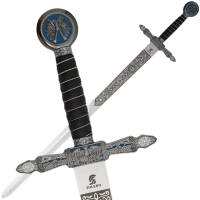 Макет меча Масонов выполненный "под серебро" с роскошной рукоятью обтянутой кожей и вытравленными гравировками на лезвии меча. Лезвие изготовлено из нержавеющей стали с высокотехнологичной обработкой (полировкой) и не заточено. Этот уникальный масонский меч содержит великое множество символов, используемых в масонстве.