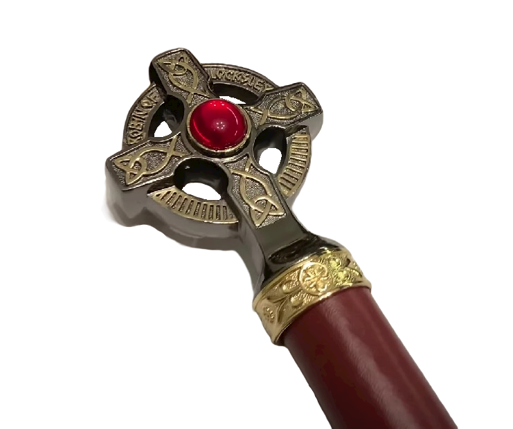 Навершие выполнено в виде кельтского креста, а в его центре установлен большой стеклянный красный камень.