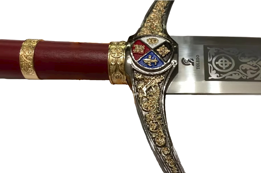 Гарда украшена растительным узором и гербом в центре, раскрашенным в красный, белый, черный и синий цвета.