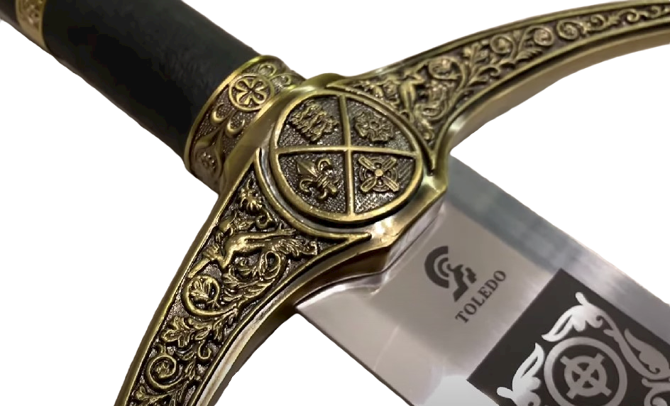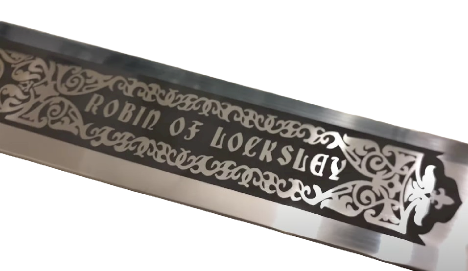 Меч "Робин Гуда" в отделке под бронзу. Навершие выполнено в виде кельтского креста, а в его центре установлен большой стеклянный красный камень. На внешнем кольце креста выведено имя "Robin of Locksle" (Робин из Локсли). Черенок обтянут черной кожей и разделен металлической вставкой бронзового цвета. Гарда украшена растительным узором и гербом в центре. Лезвие изготовлено из нержавеющей стали с высокотехнологичной обработкой (полировкой) и не заточено. На лезвии выгравировано и заполнено черным цветом имя "Robin of Locksle" (Робин из Локсли), окруженным цветочными узорами с завитками плюща и кельтским крестом.