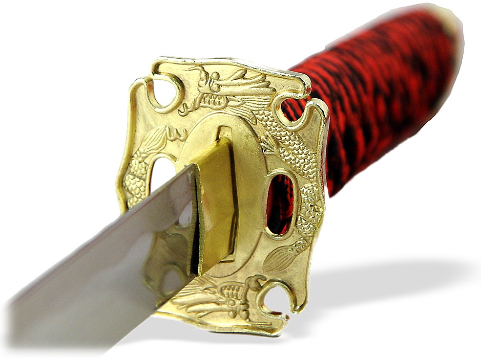Действительно неотразимый японский меч Катана с цубой под золото и яркими ножнами цвета алый мрамор.