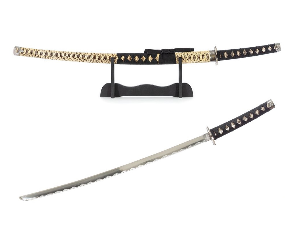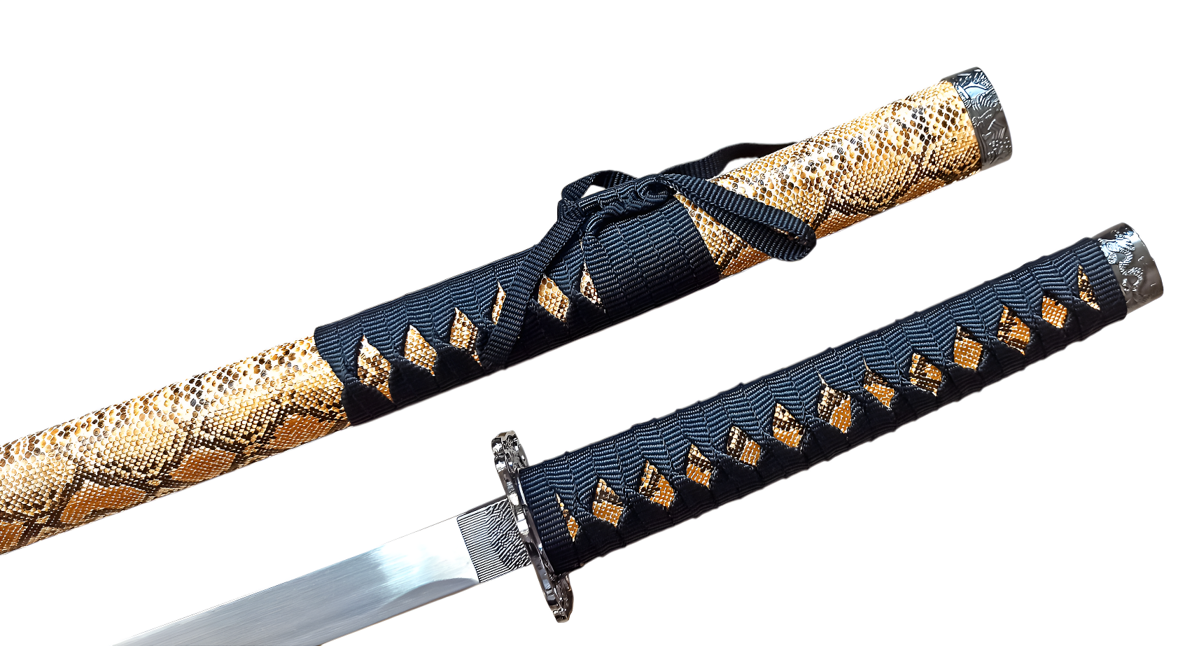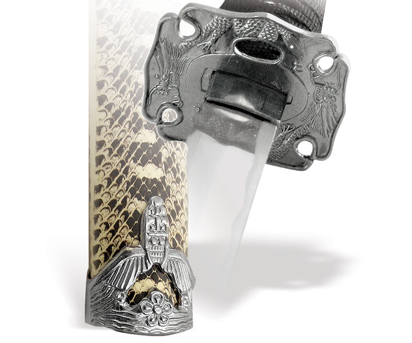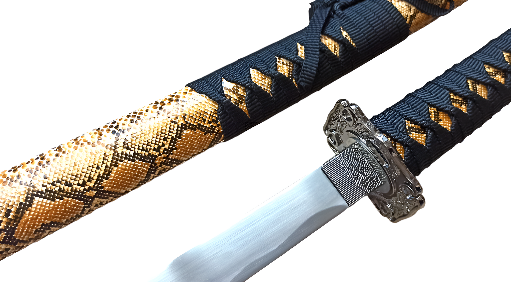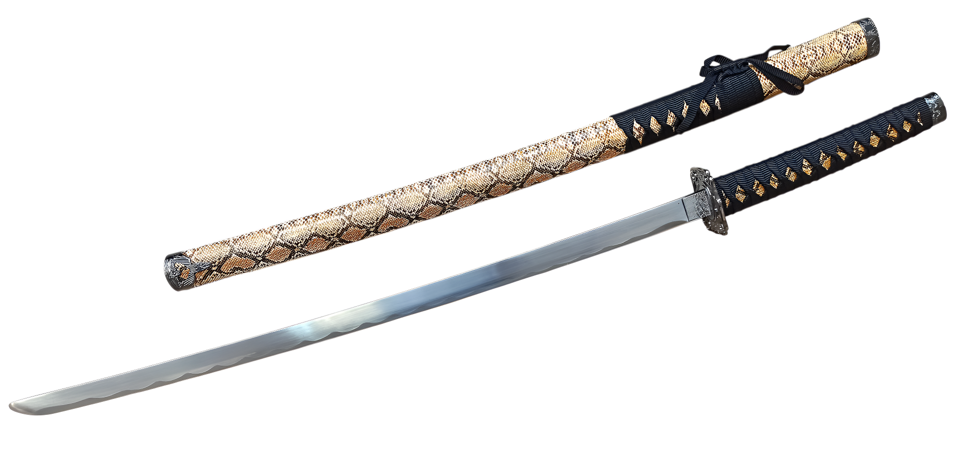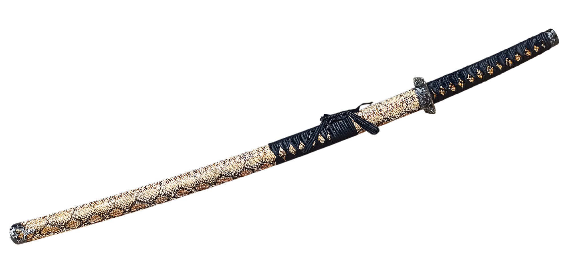 Меч Самураев с ножнами под змеиную кожу с эффектной цубой с японскими мотивами.