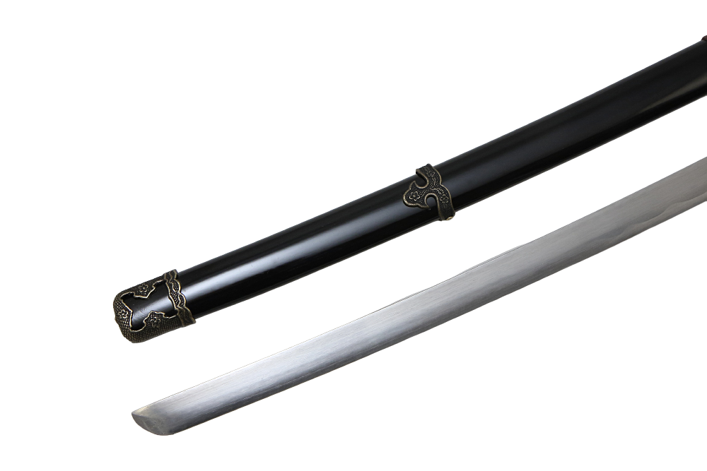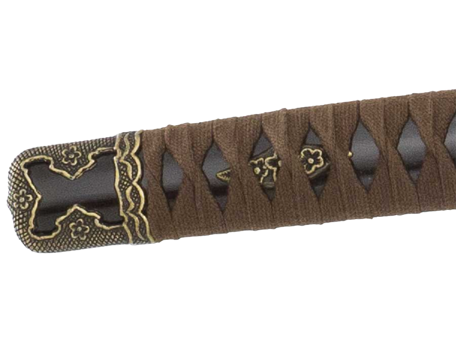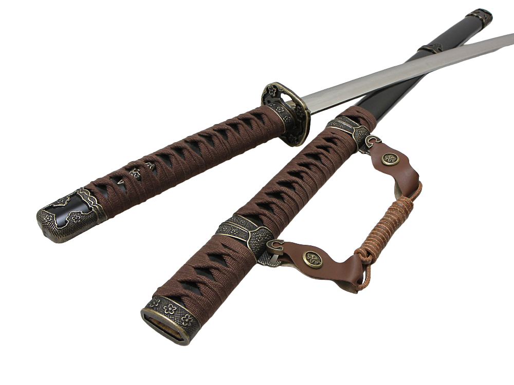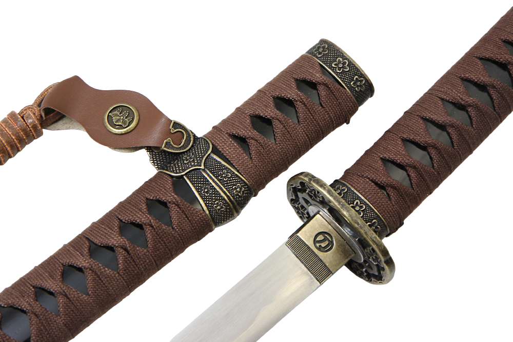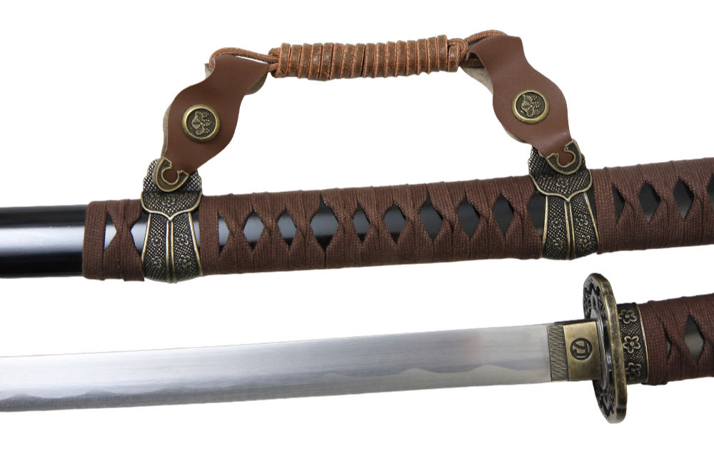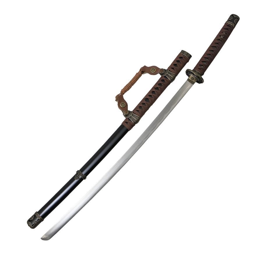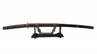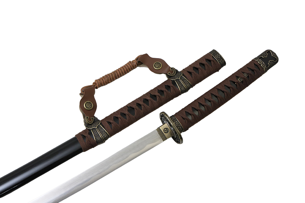 Самурайский меч Тачи (Тати) с роскошной бронзовой цубой, черно-коричневой рукоятью и яркими черными ножнами.