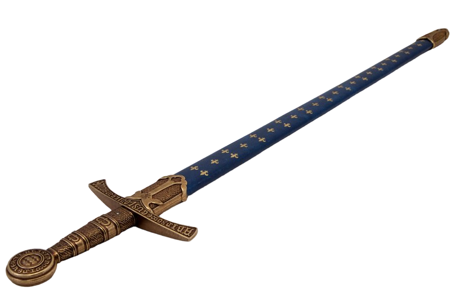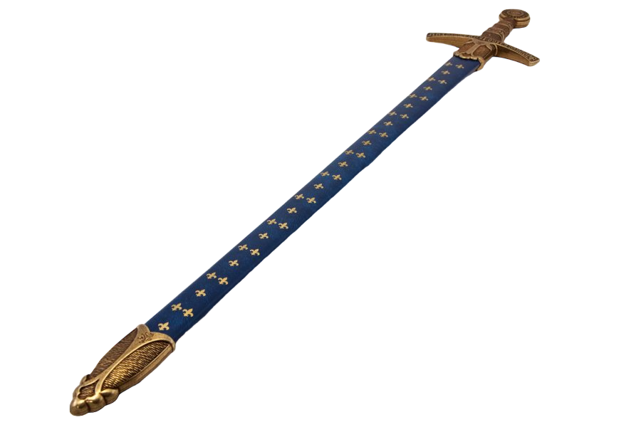 Ножны выполнены из пластика и обтянуты экокожей синего цвета с изображением лилий Флер-де-Лис. Устье и наконечник ножен изготовлен из металла.