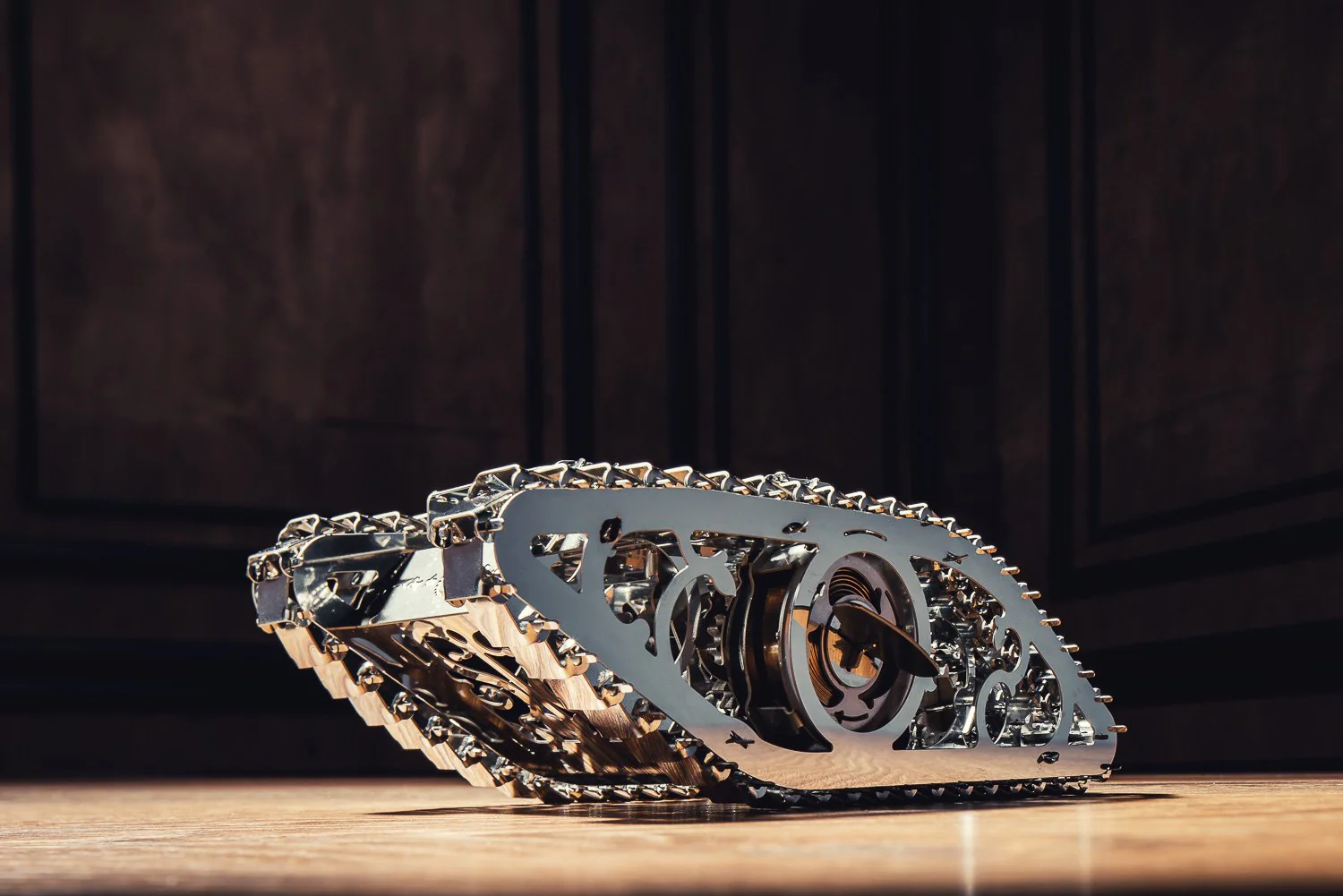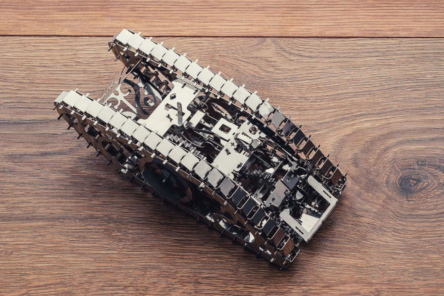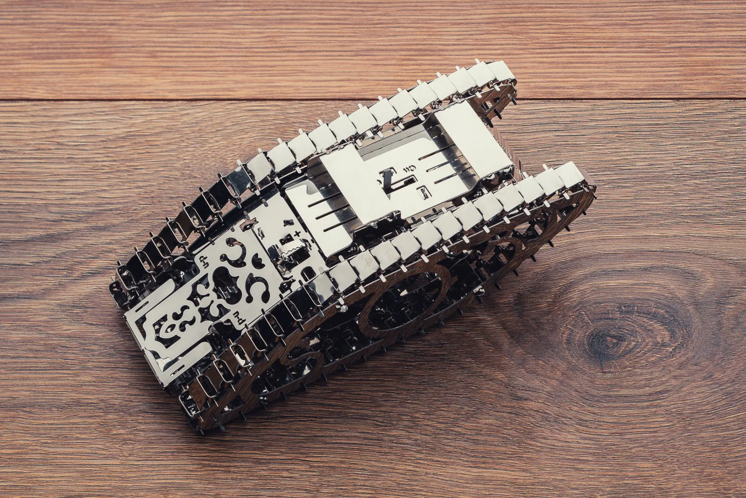 Самоходный механизм может преодолевать препятствия благодаря своим блестящим гусеницам.