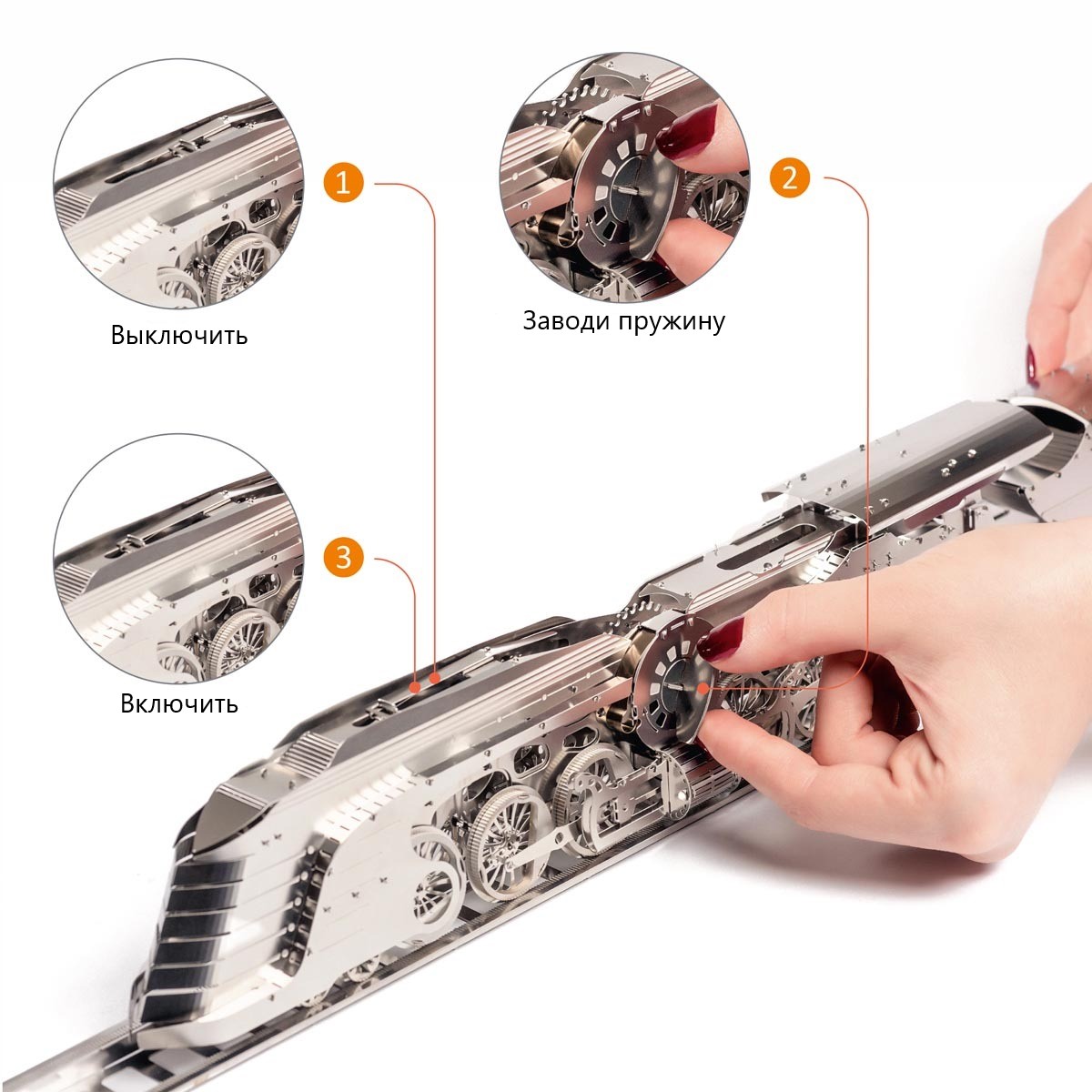 Модель оснащена пружинным механизмом. Сверху и сбоку можно наблюдать движения шестерни и маховика внутри поезда. Компоновка колёс напоминает знаменитый Union Pacific 4000 «Big Boy».