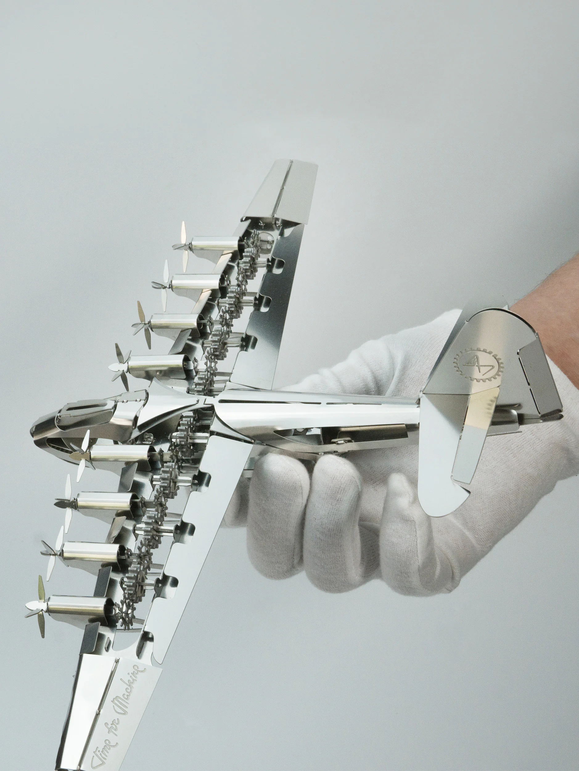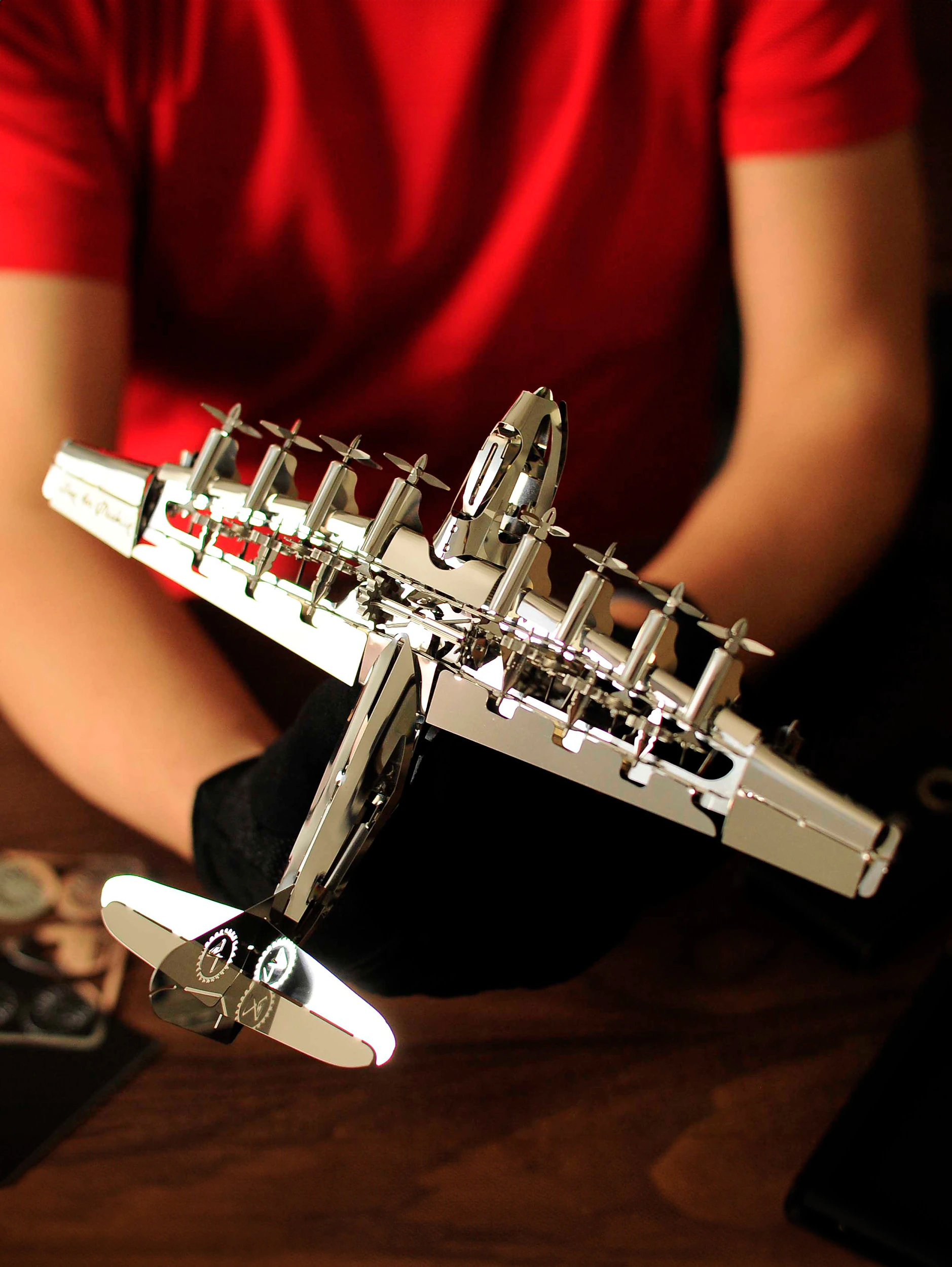 Модель конструктора работает от механизма, спрятанного в его основании. Специальная механическая формула позволяет всем пропеллерам модели двигаться одновременно. Самолёт можно снять с его подставки для перемещения или осмотра.