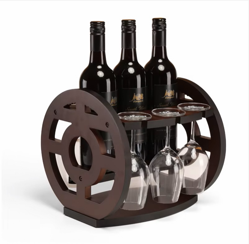 Искусно вырезанные элементы с приятной на ощупь текстурой образуют изящные формы, надежно удерживающие бутылку и бокалы.
