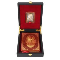 Оригинальный подарочный набор включает в себя книгу в кожаном переплете "Молитвослов православного казака", содержащий различные молитвы, заповеди и исповеди казака и икону «Казанской Божьей Матери», оформленных в деревянной коробке, обтянутой кожей.