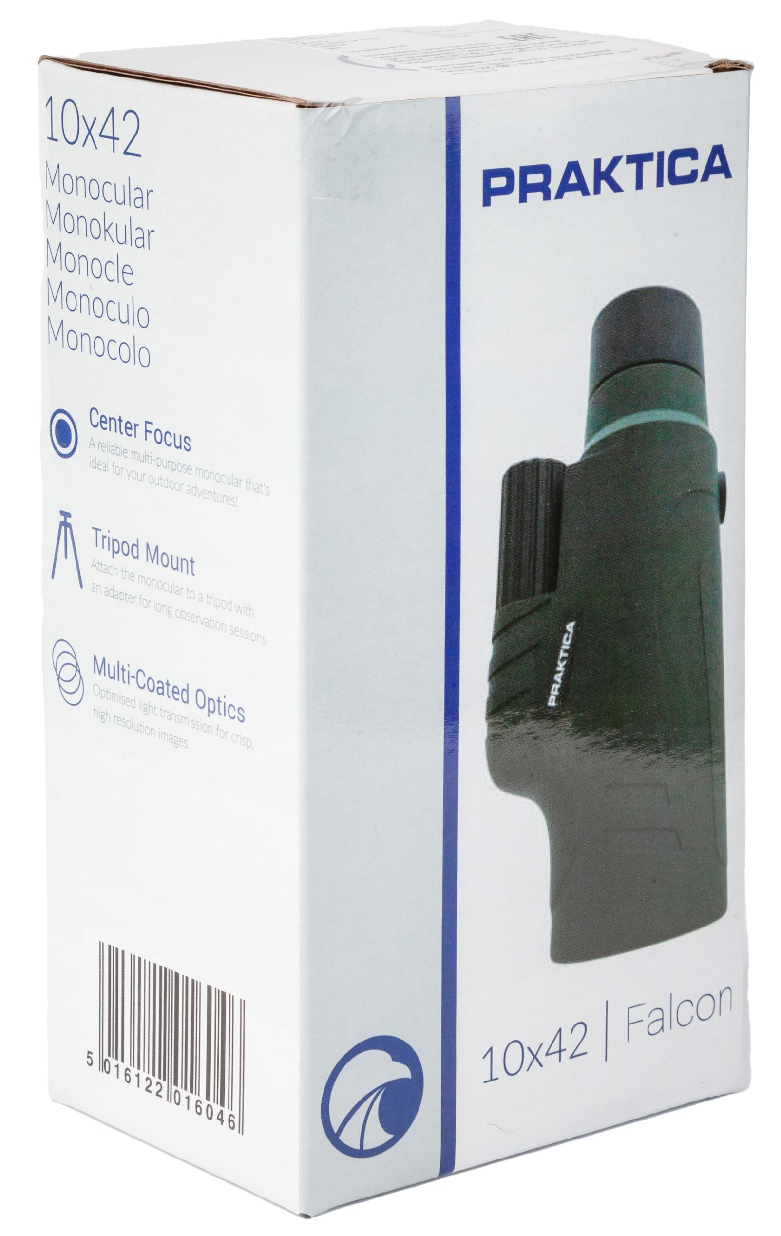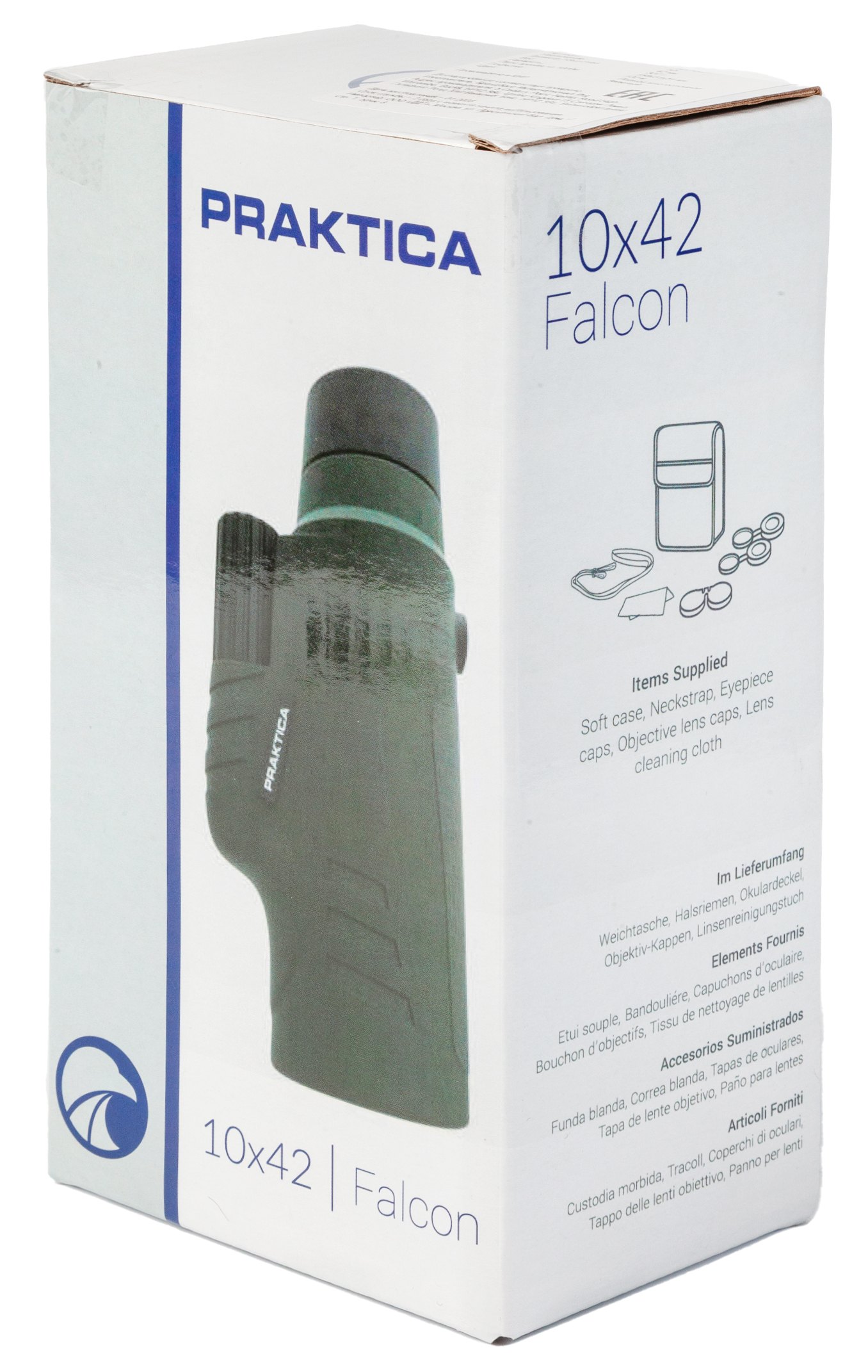 PRAKTICA Falcon 10x42 WP – это монокуляр для самых разных целей: его можно взять с собой на охоту, выезд на природу, спортивное мероприятие или просто пешую прогулку. Компактный размер и удобная конструкция позволят управлять прибором одной рукой. Большой диаметр объектива 42 мм и полное многослойное покрытие оптики дают высокую светопропускную способность, поэтому изображение не потеряет качества при недостаточном освещении.