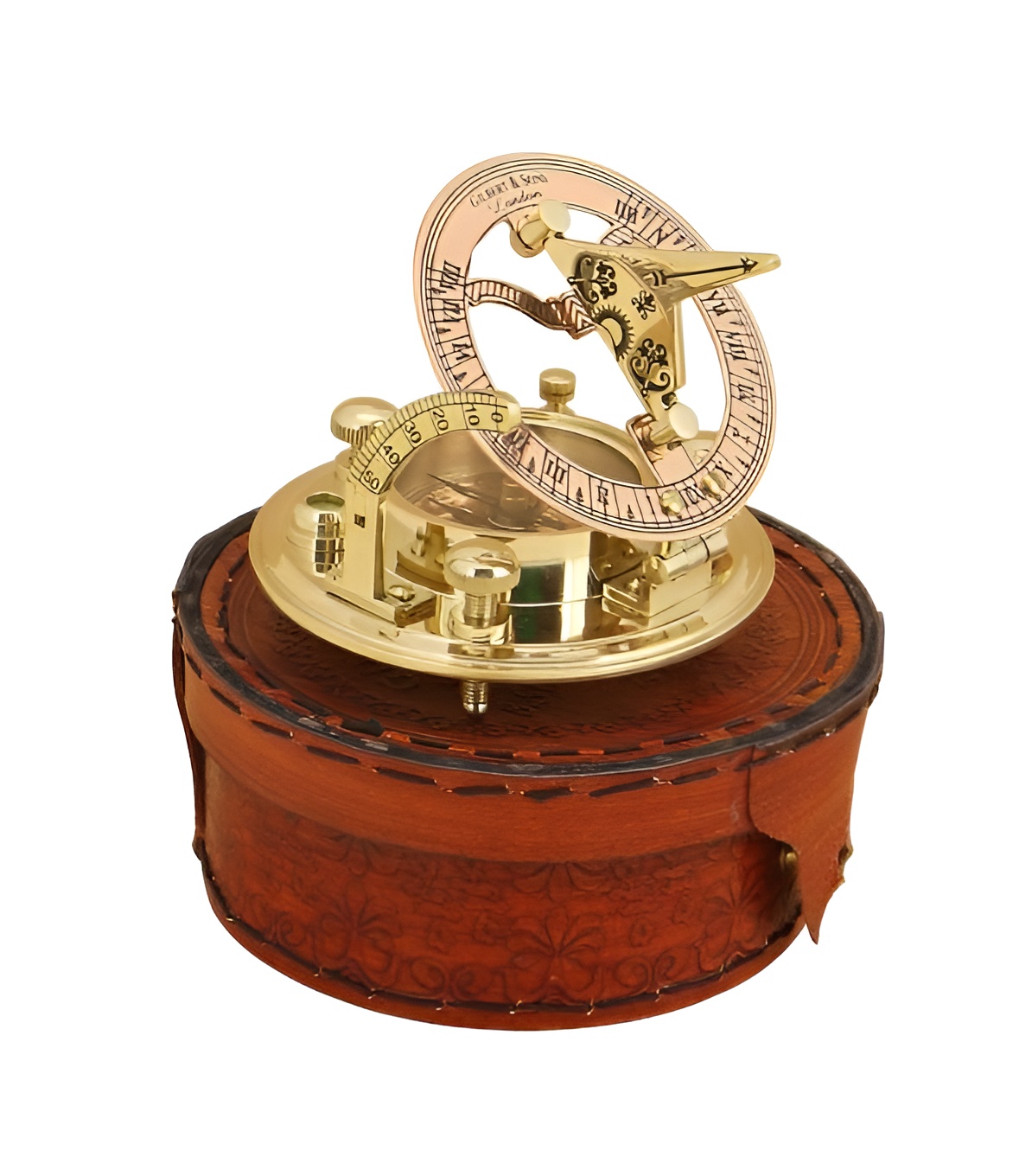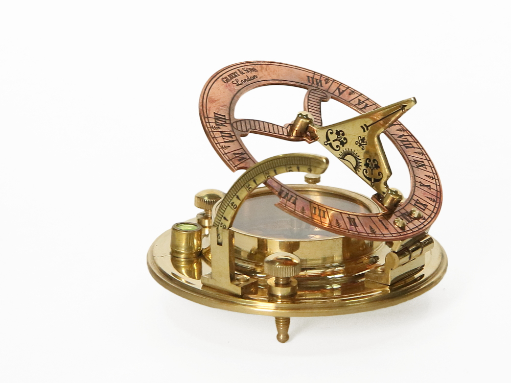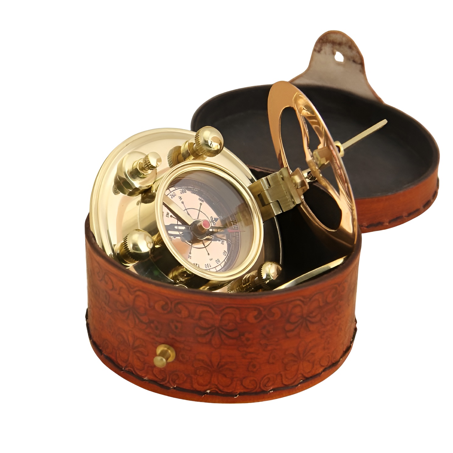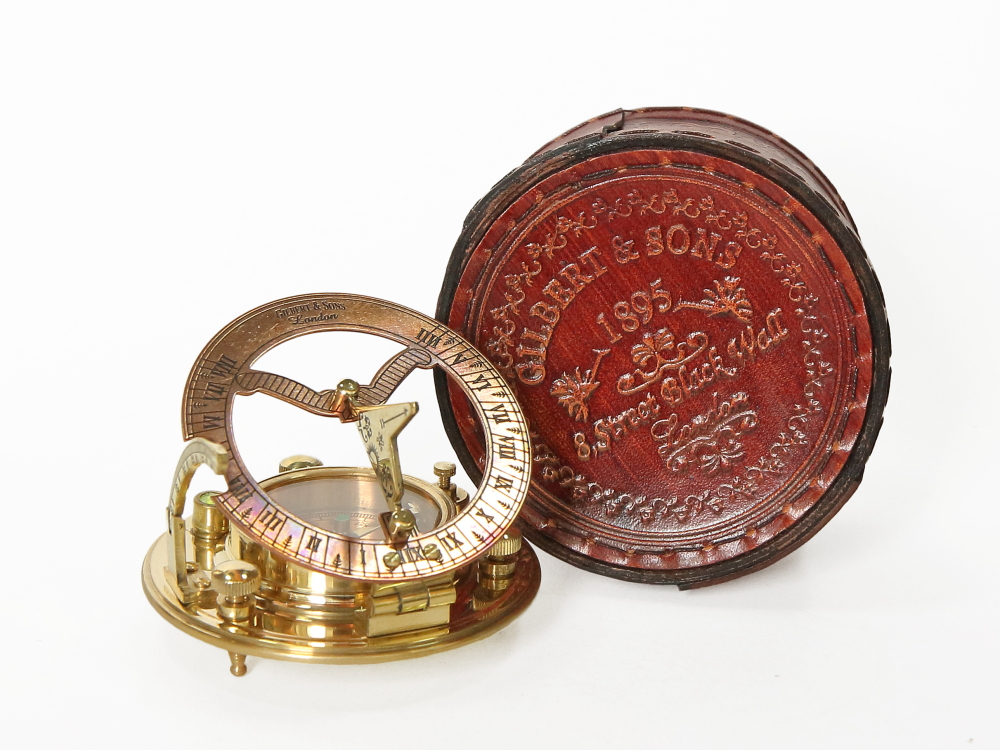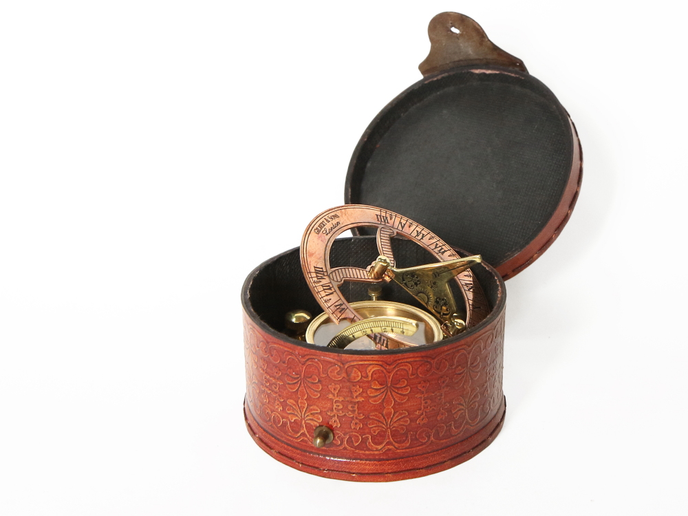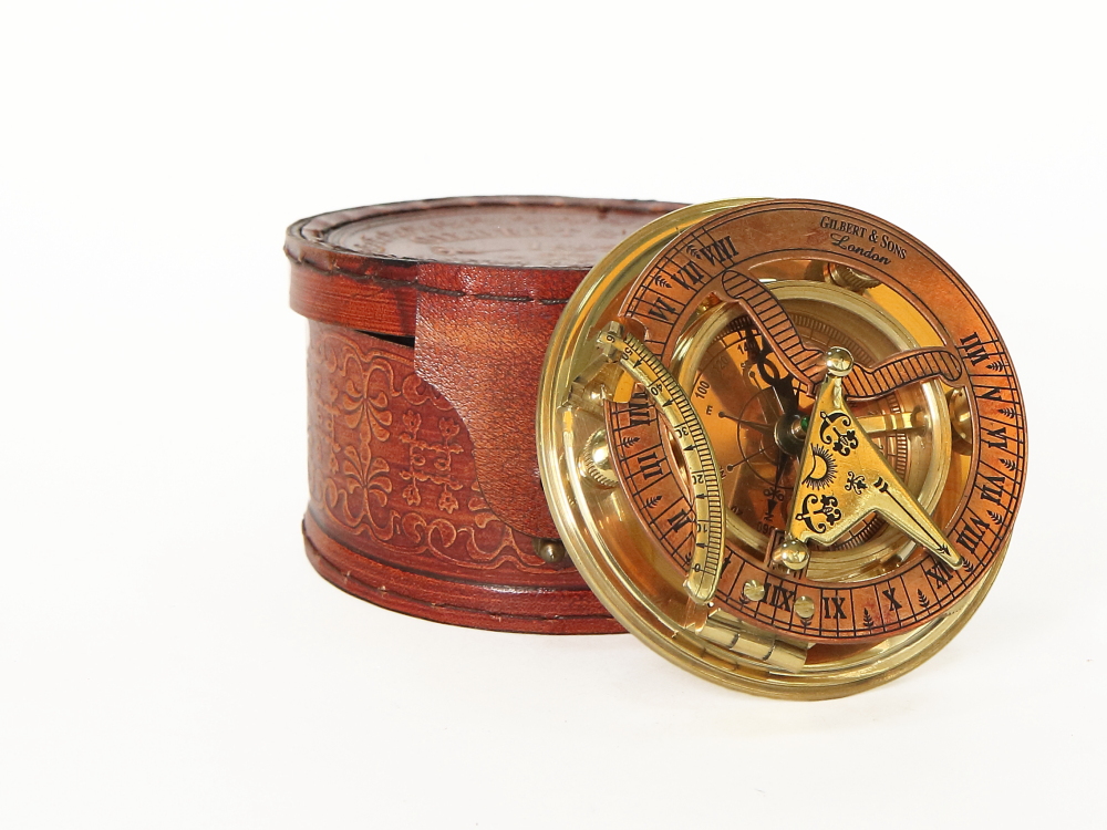 Морской компас с солнечными часами в кожаном футляре