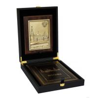 Оригинальный подарочный набор включает в себя книгу в кожаном переплет "Москва" и плакетку, оформленных в деревянной коробке, обтянутой кожей.
