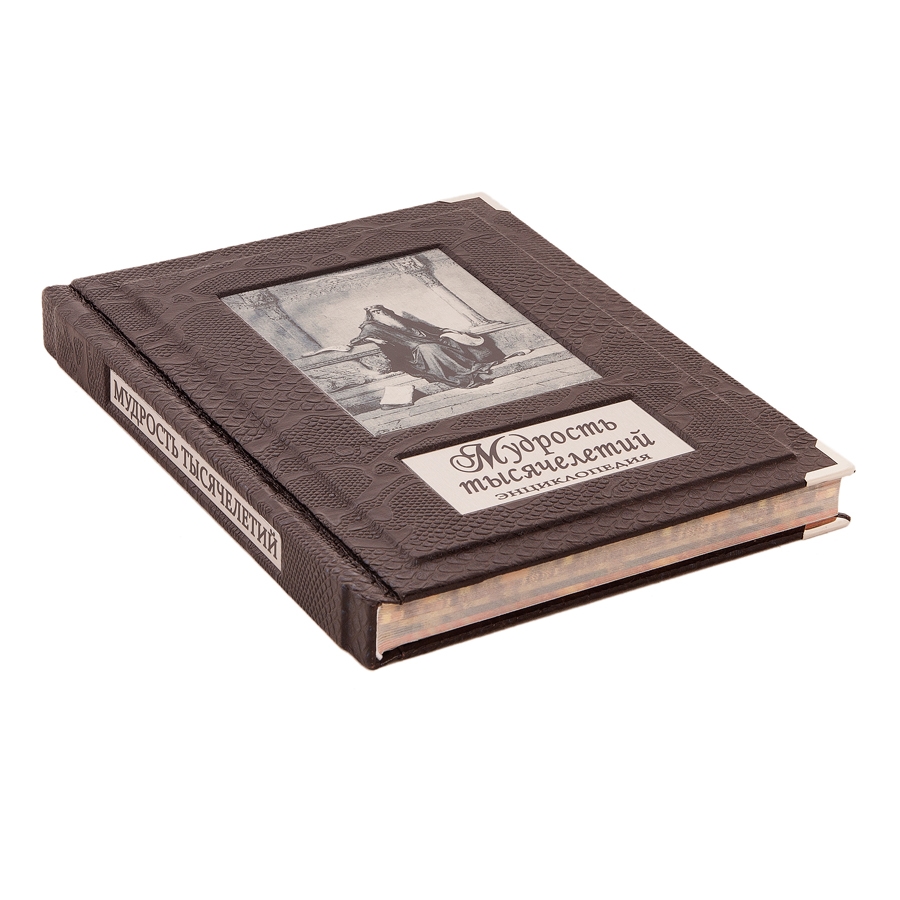Цельнокожаный переплёт ручной работы, украшен иллюстрированной вставкой из цветного металла.