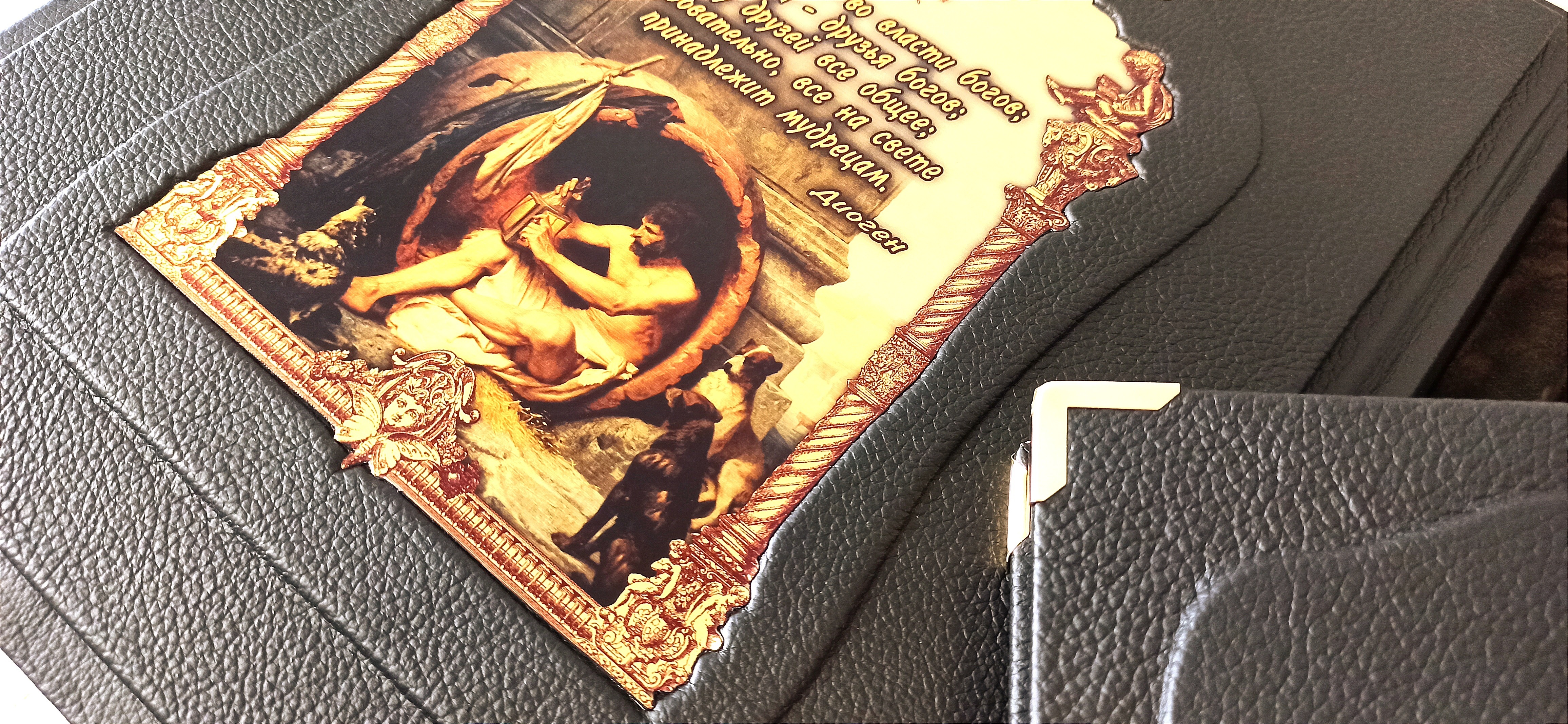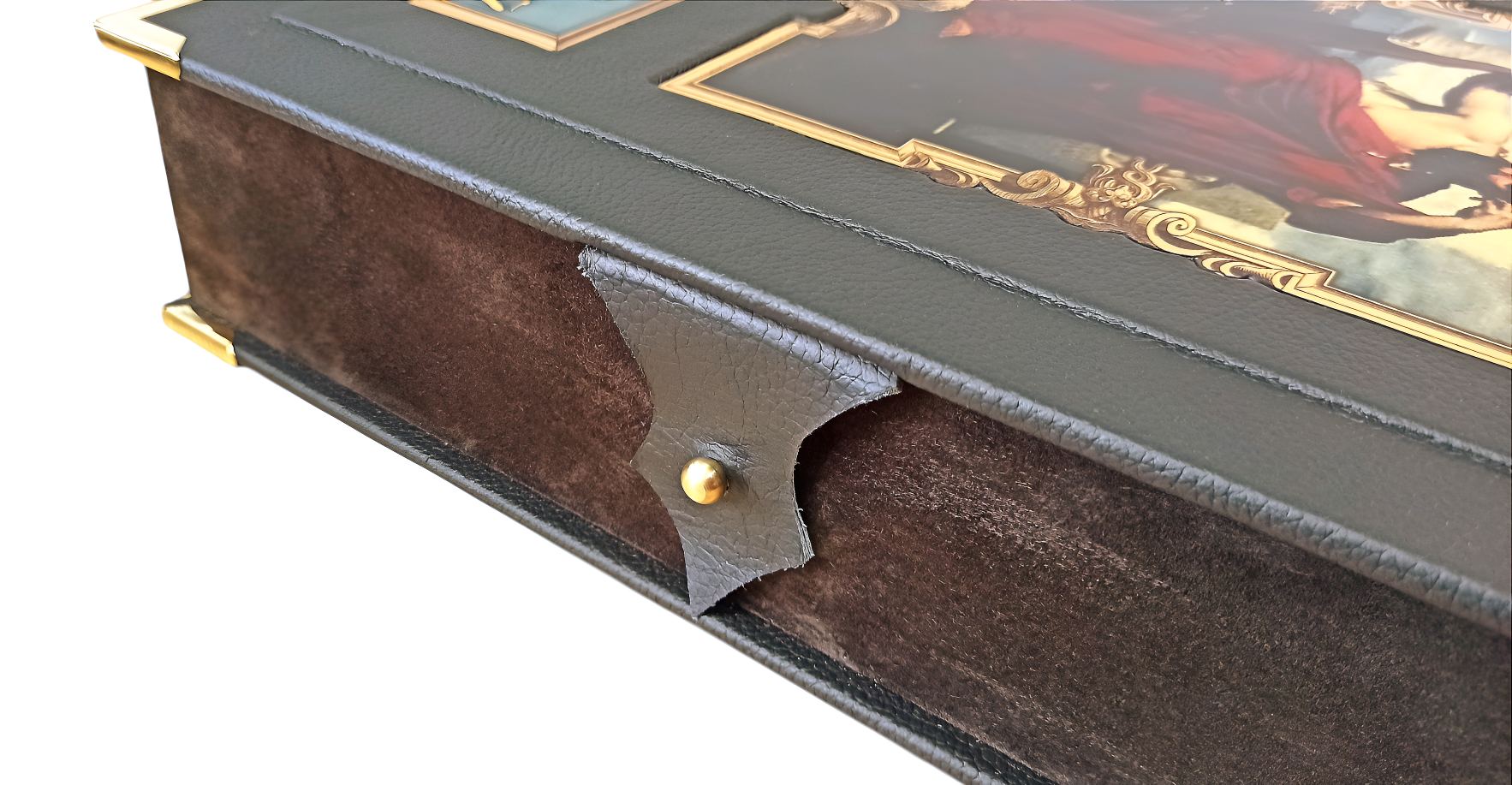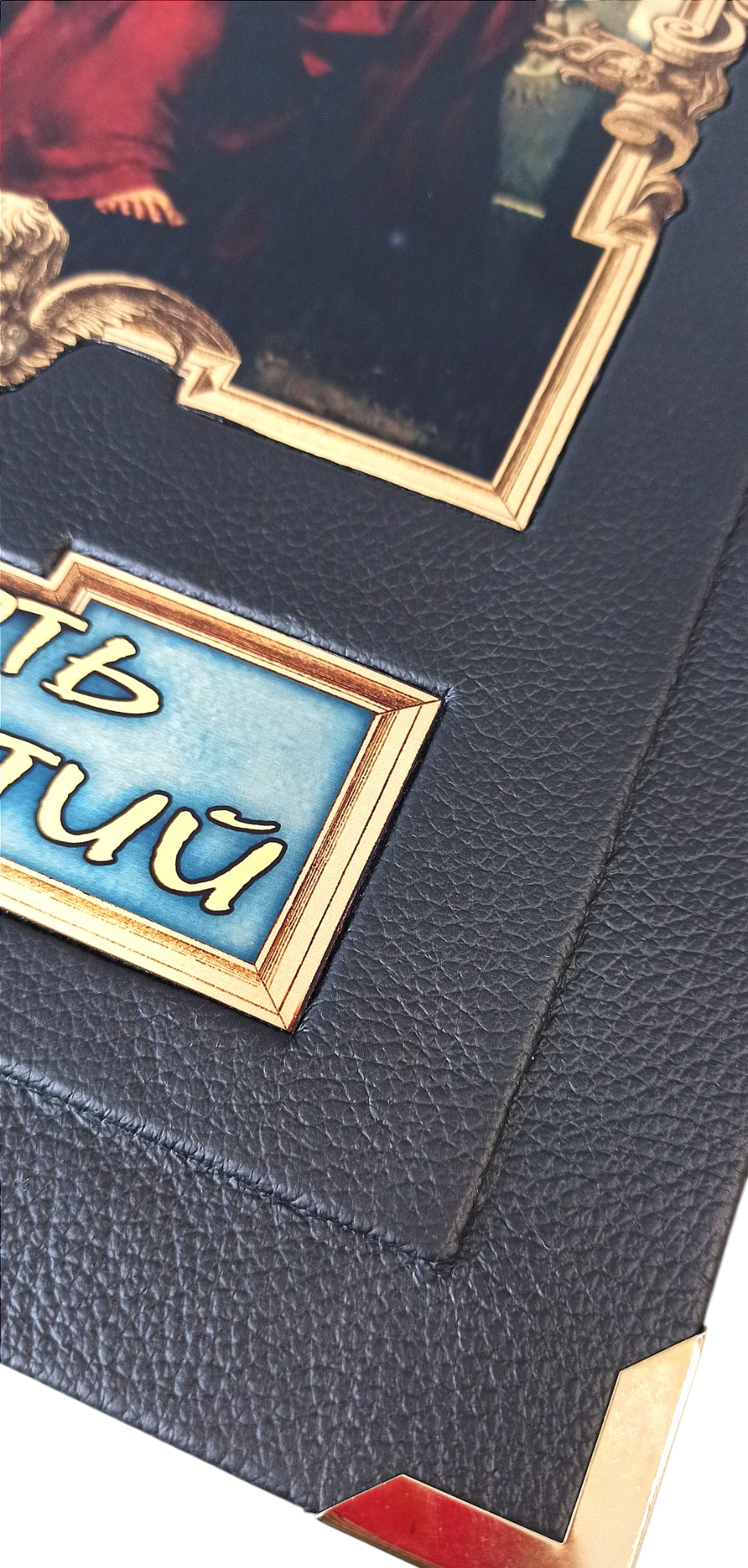 Цельнокожаный переплёт ручной работы, украшен иллюстрированной вставкой из цветного металла.