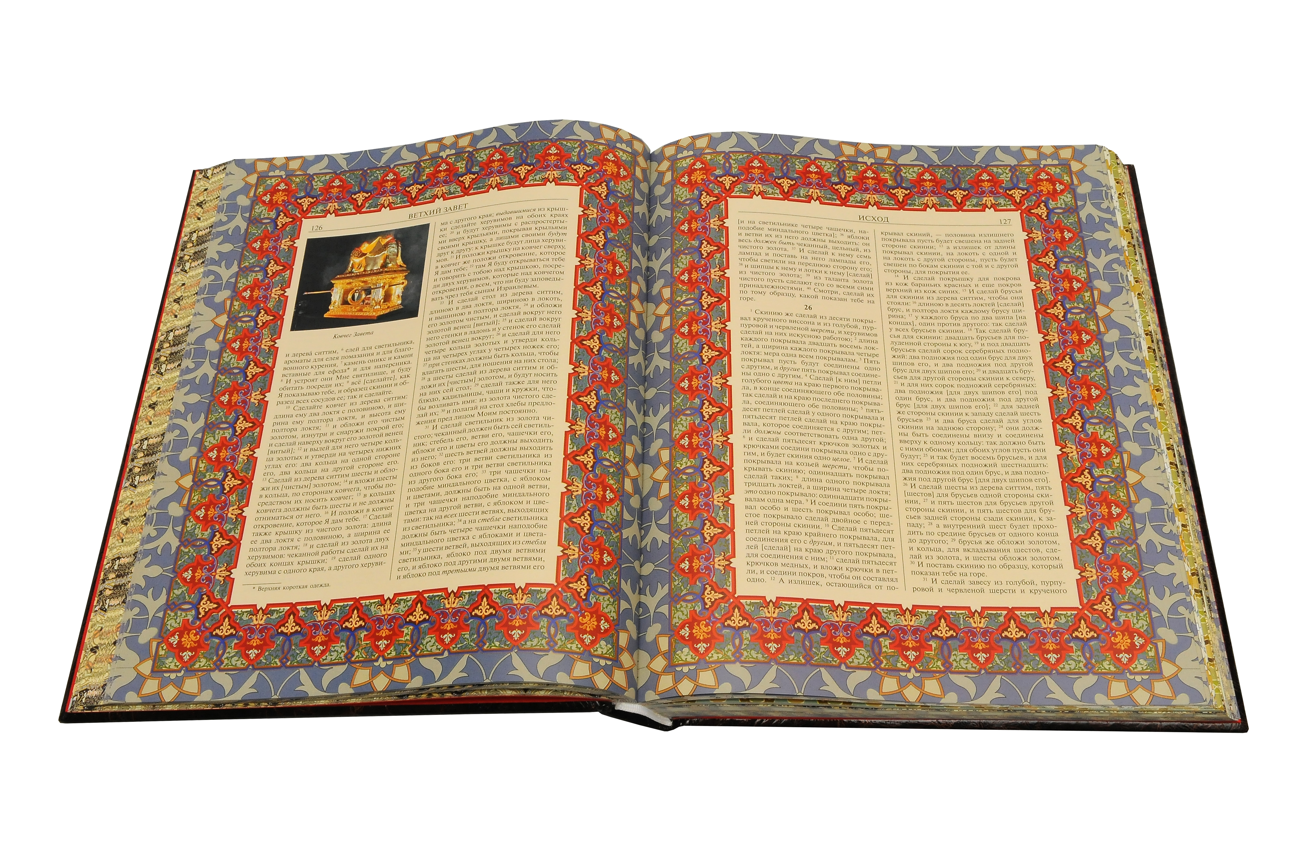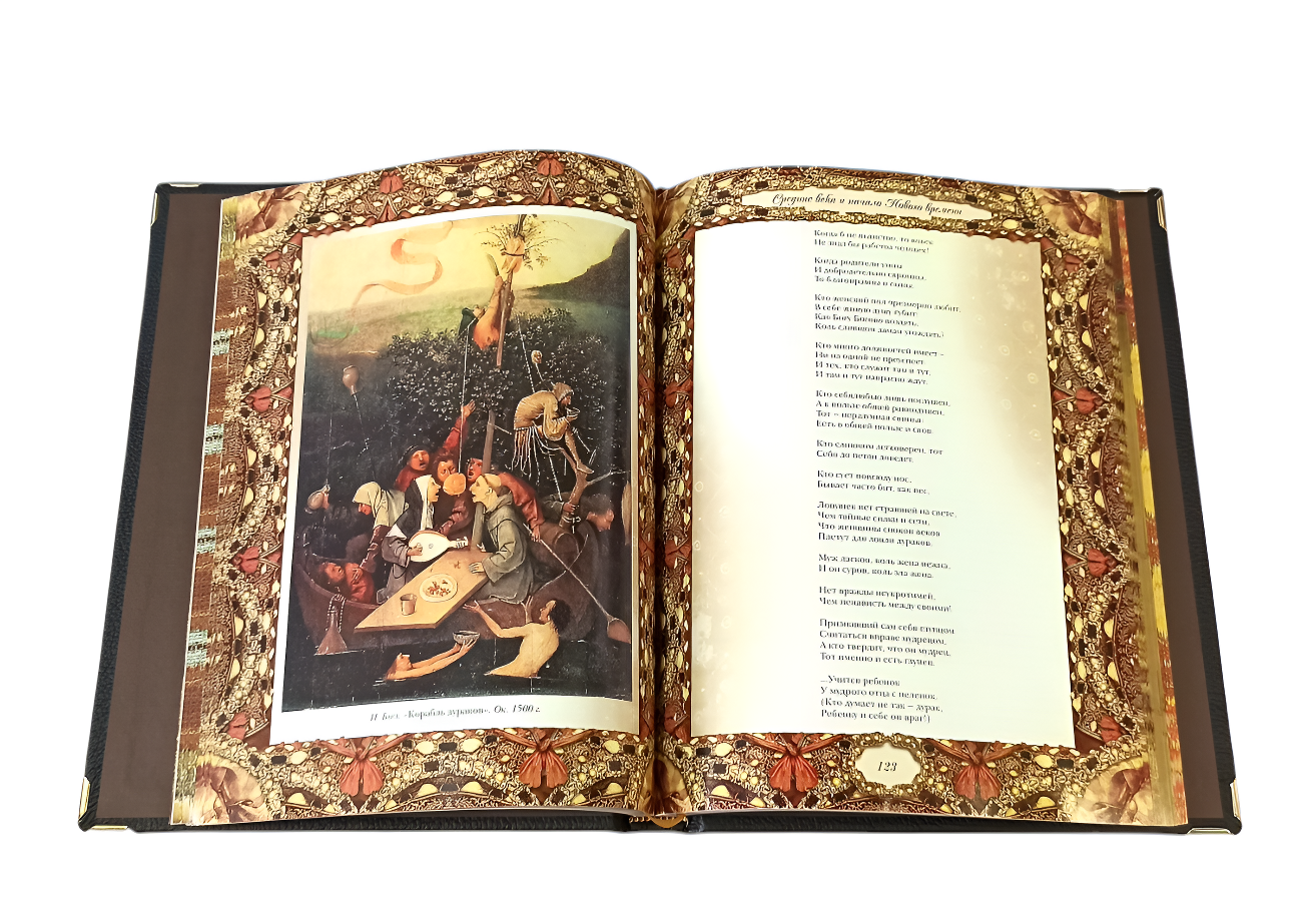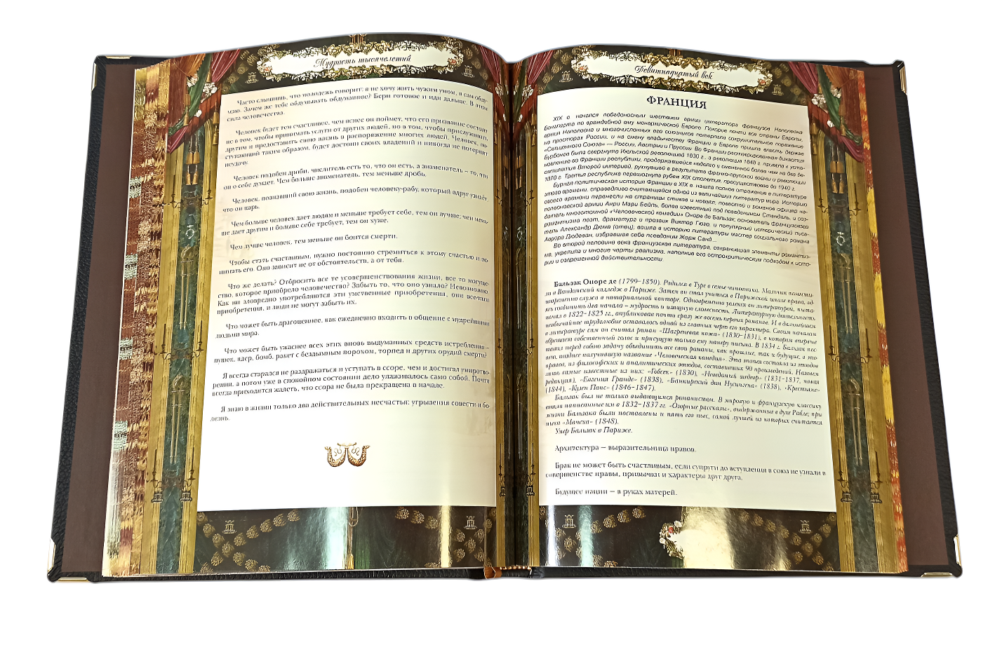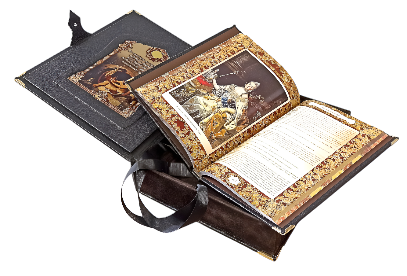 Цельнокожаный переплёт ручной работы, украшен иллюстрированной вставкой из цветного металла.