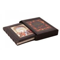 Цельнокожаный переплёт ручной работы, украшен иллюстрированной вставкой из цветного металла.