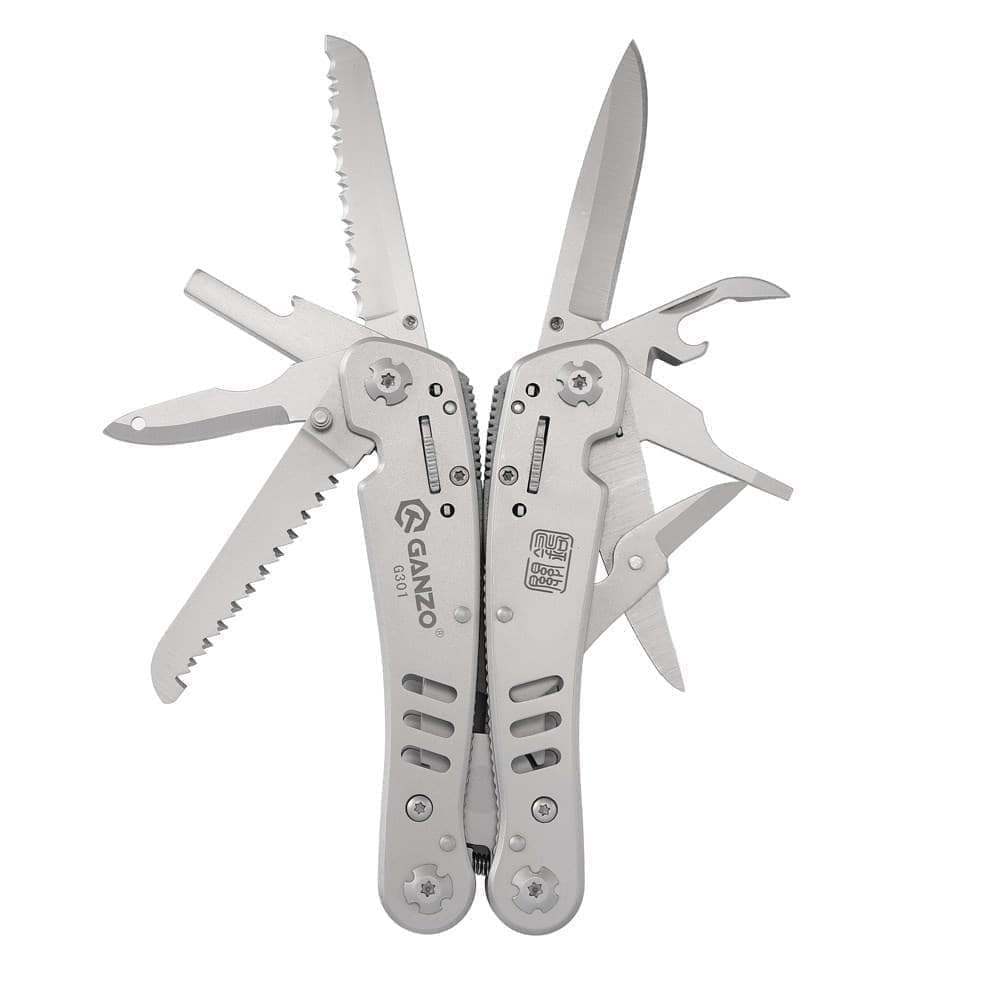 Удобный полноразмерный мультитул G301 от компании Ganzo. Большой набор инструментов позволяет использовать модель G301 для полноценного ремонта разнообразной техники. В комплект мультитула G301 входят следующие инструменты: подпружиненные плоскогубцы с кусачками, два лезвия, одно из которых имеет серрейторную заточку, две плоских отвертки разного размера, пилу по дереву, ножницы, зенковку, удлинитель для адаптера, консервный нож.