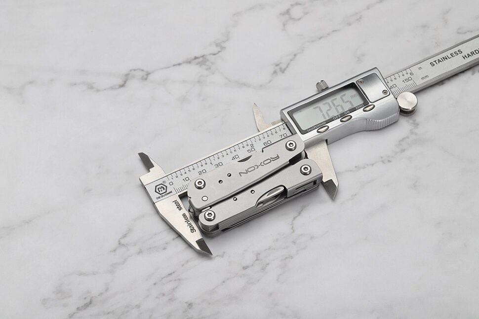 В закрытом положении габариты мультиинструмента составляют 70,5*29,5*17 миллиметров. В раскрытом положении размеры достигают 97,5*99*17 миллиметров. Вес изделия составляет всего 127 грамм. Это довольно лёгкая модель.