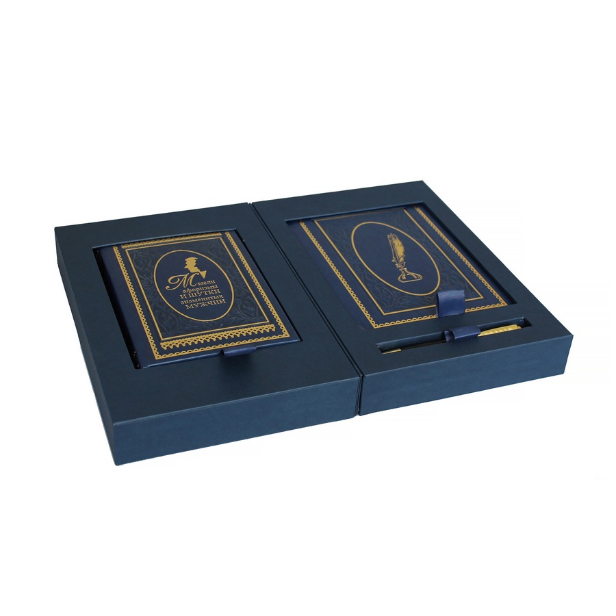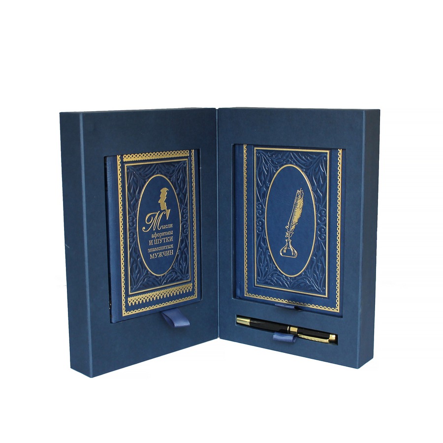 - В книге «Мысли, афоризмы и шутки знаменитых мужчин» представлены знаменитые мужчины всех времен — от Адама до Путина, или, по алфавиту, от Абеляра до Явлинского. Издание представлено в классическом стиле, изобретенном в XVII-XVIII веках. Золотое тиснение, крашеный в тон переплетного материала обрез, блинт.
