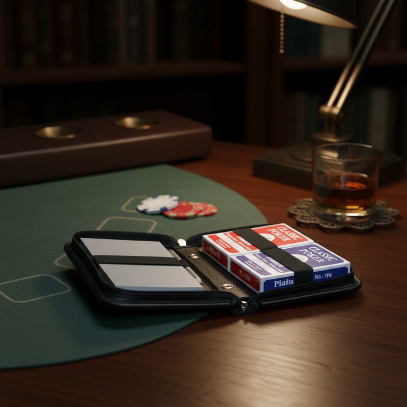 Дорожный набор для игры в карты «Азарт» в чехле из натуральной кожи уже укомплектован всем необходимым для приятного времяпровождения - двумя колодами пластиковых игральных карт по 55 листов, блокнотом и грифельным карандашом, с помощью которых можно вести точный счет партий и выигрышей.