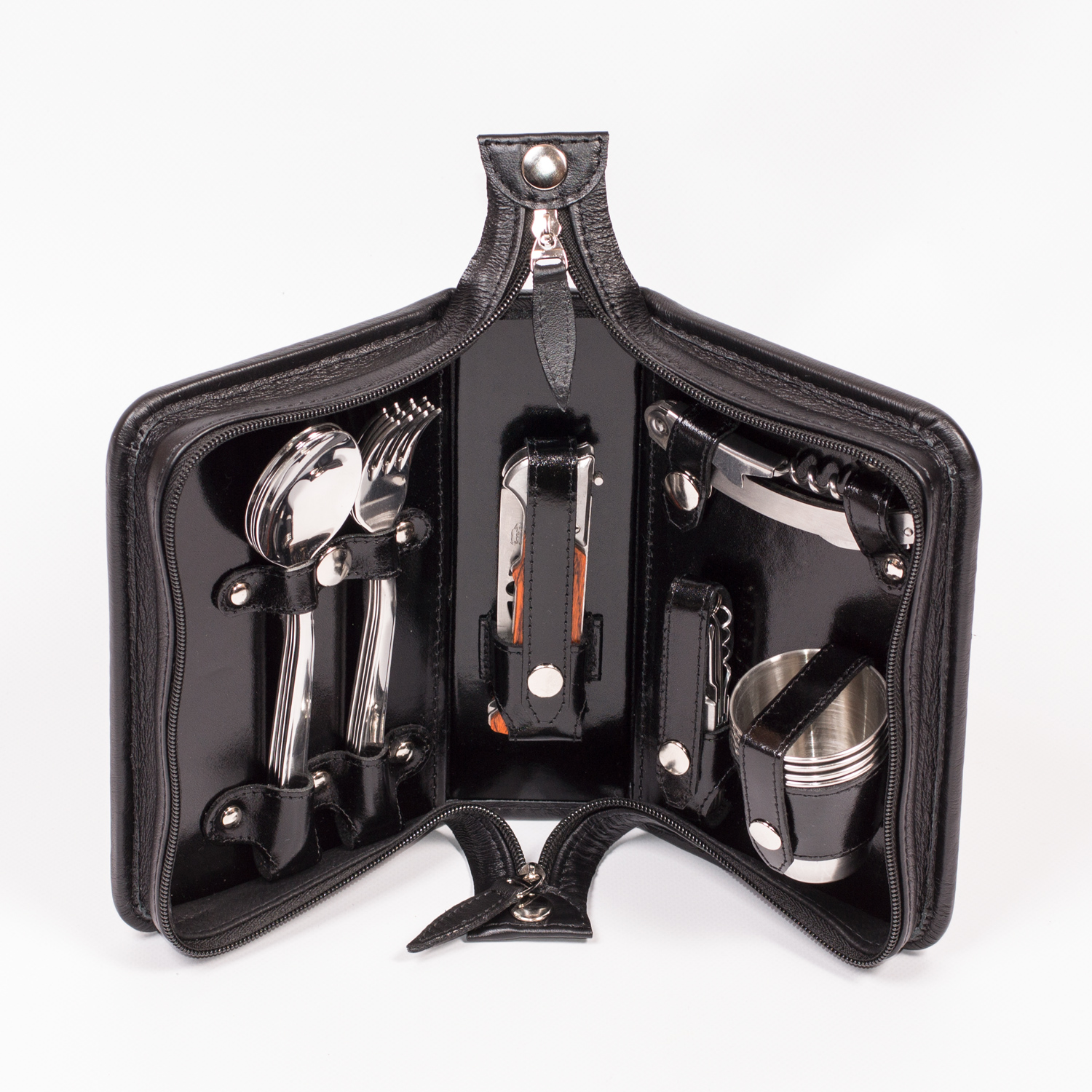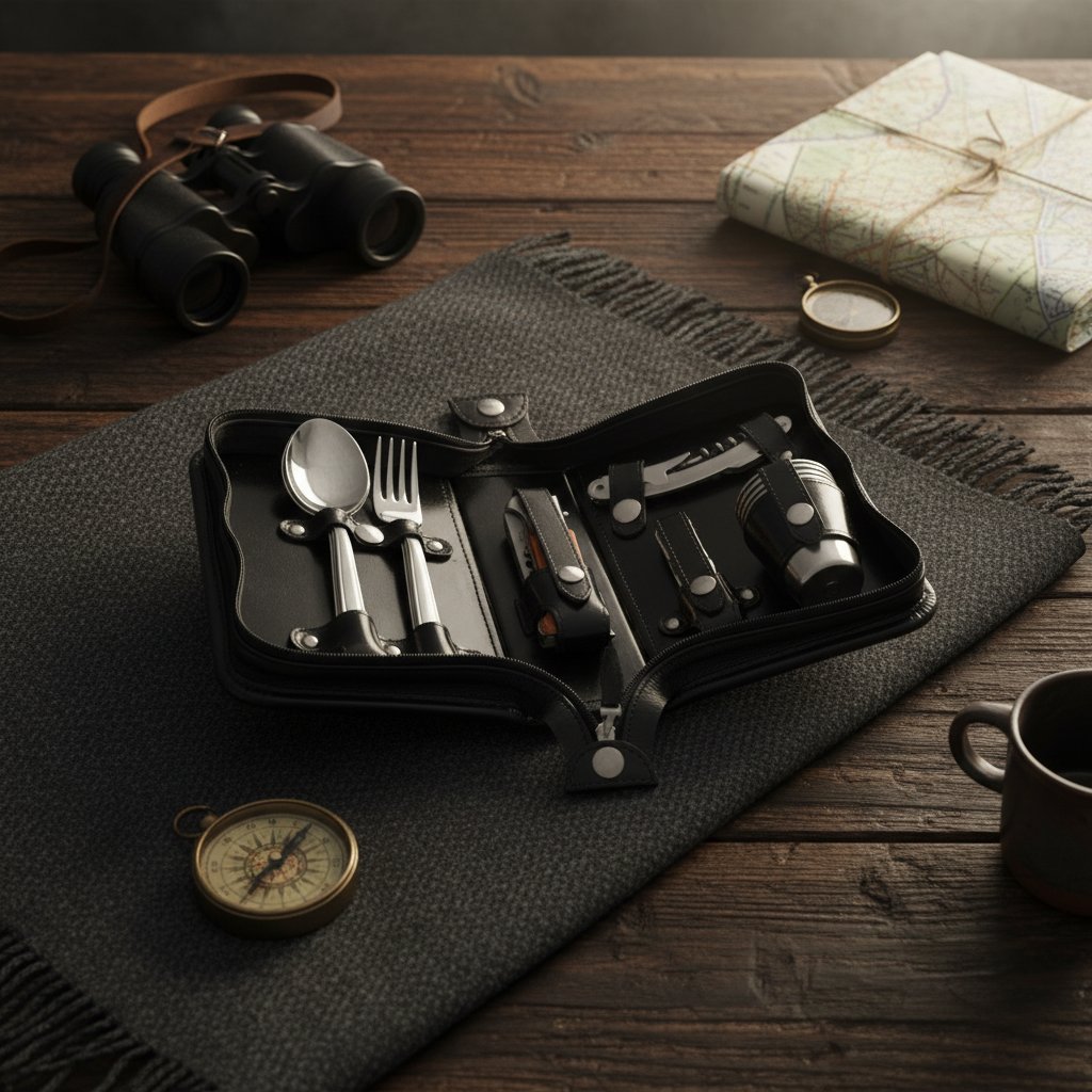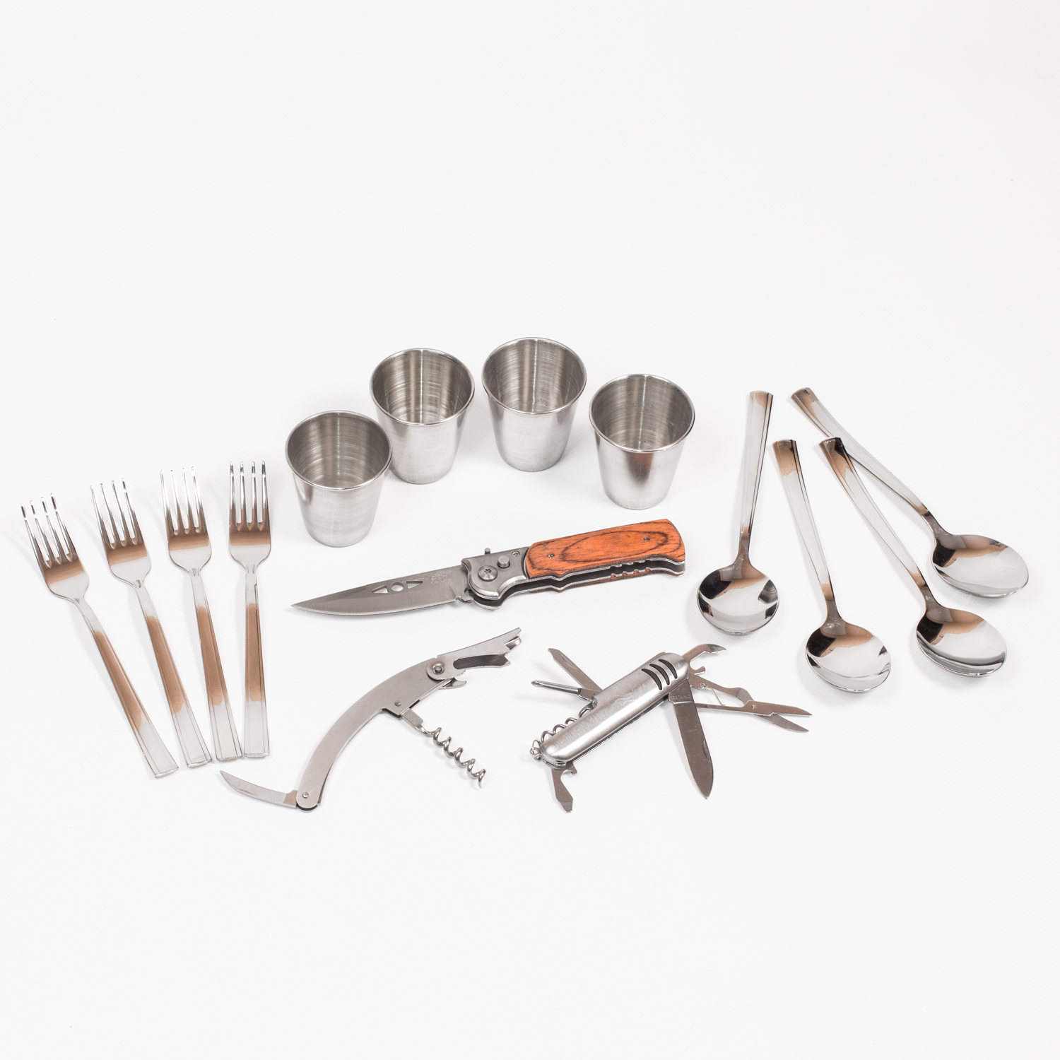 В состав набора входят аксессуары, рассчитанные на 4 персоны: вилки, ложки, стаканы из нержавеющей стали в количестве 4 штук, складной нож с суперострым лезвием, штопор сомелье и зажигалка, которая не даст осечки даже при высокой влажности.