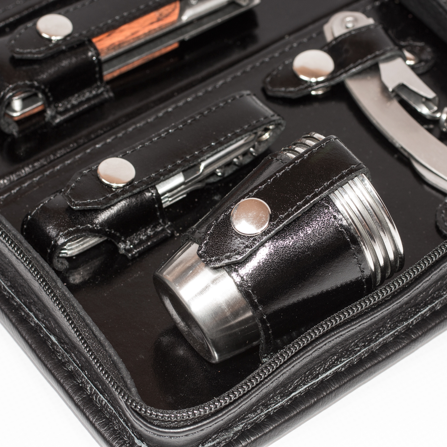 Этот дорожный набор - настоящая сокровищница путешественника, которая укомплектована самыми необходимыми вещами и заключена в сумку из натуральной кожи со стильным и лаконичным дизайном.
