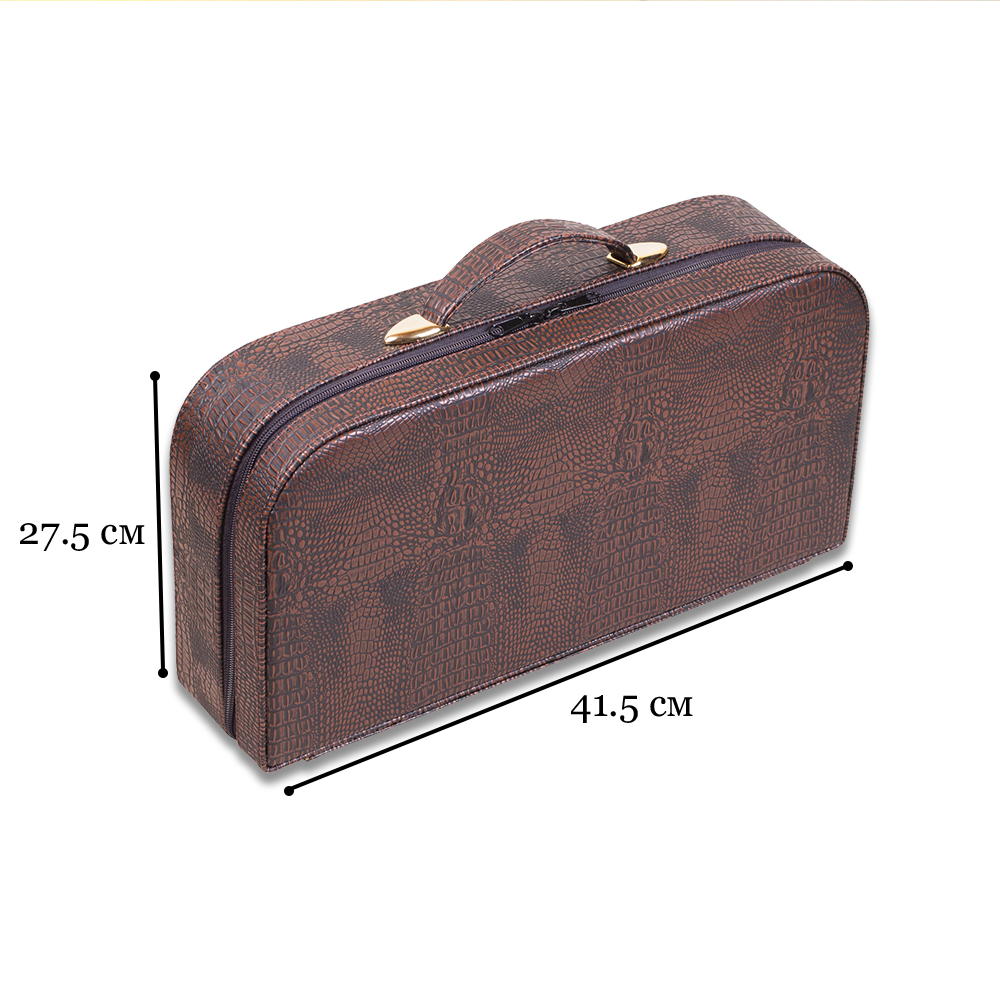 Хранится он в удобном небольшом кейсе, жесткий каркас которого обтянут прочной и эстетичной эко-кожей с декоративным поверхностным тиснением «под крокодила».