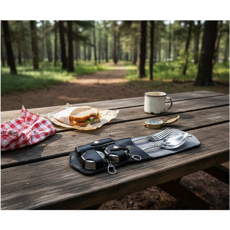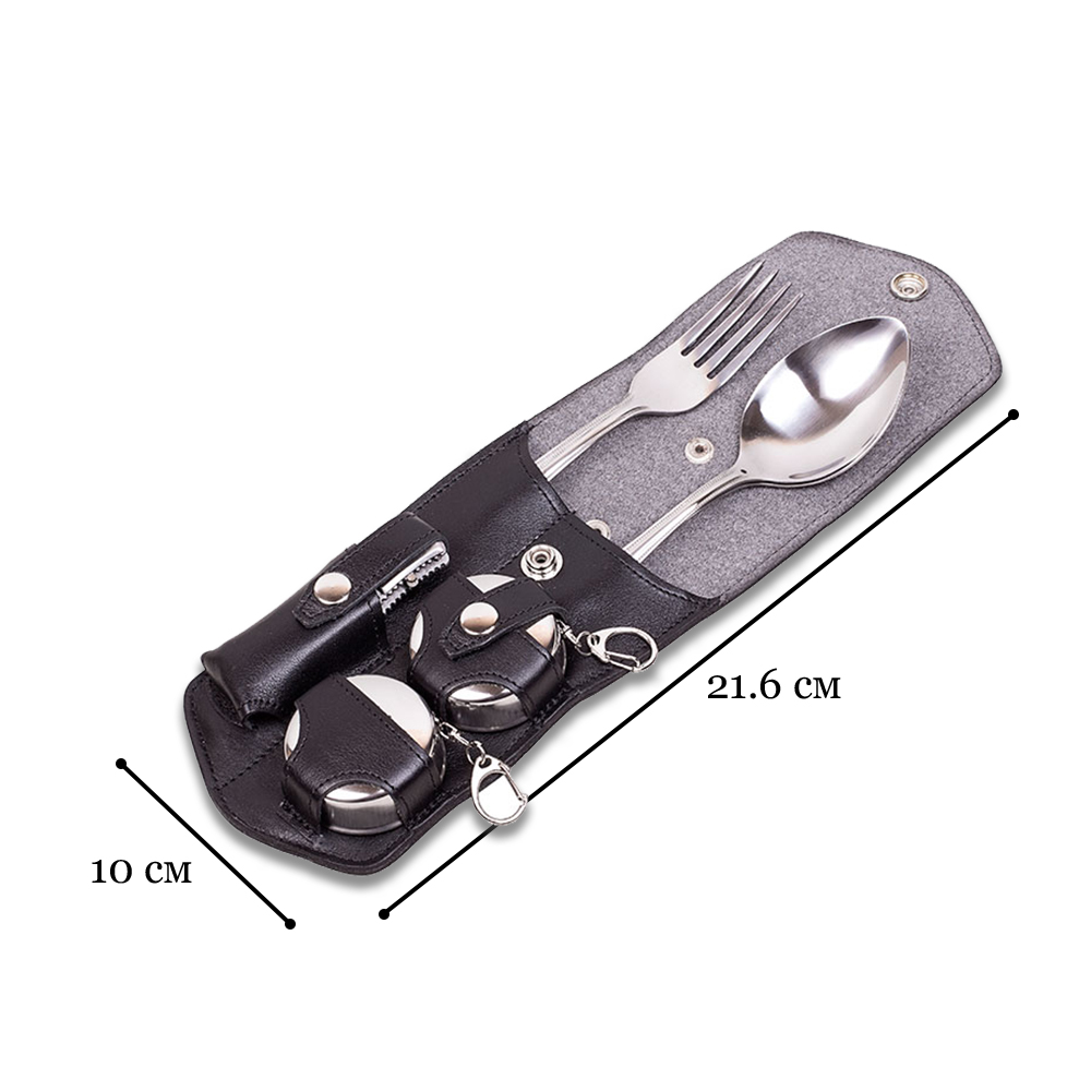 Он включает в себя комплект на двух человек – ложки, вилки, складные стопки.