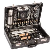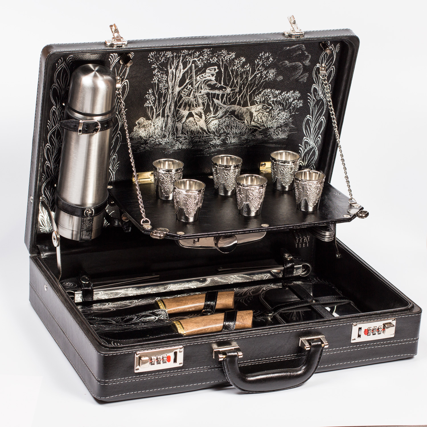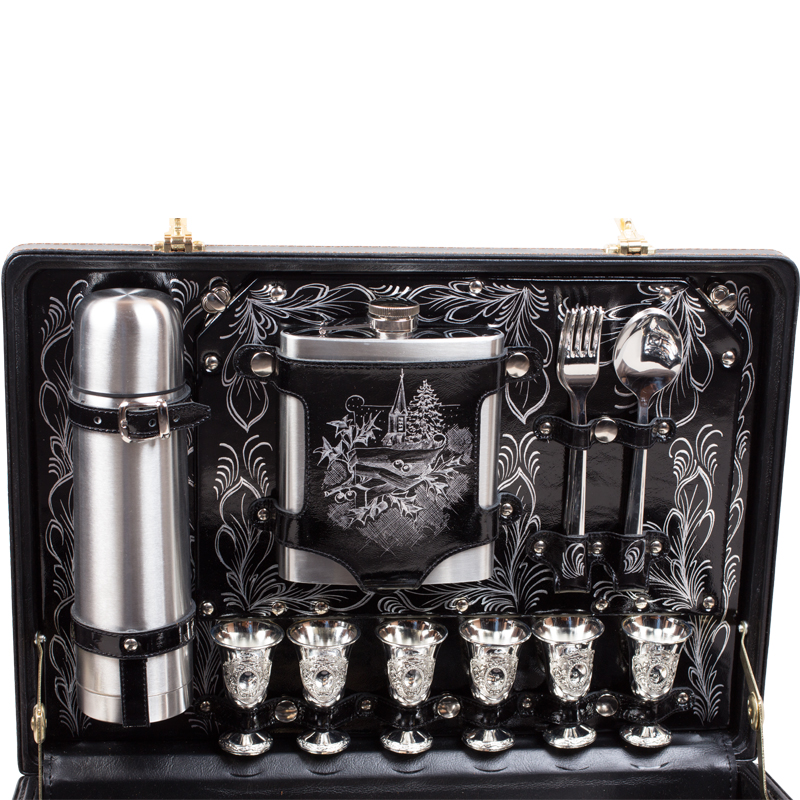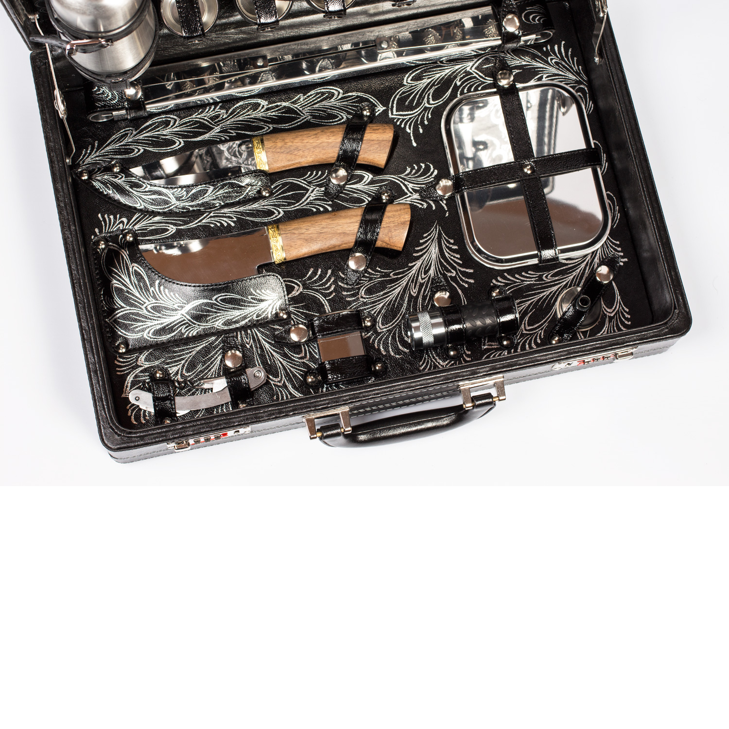 Кейс из кожзаменителя с внутренней отделкой из натуральной кожи, росписью серебром ручной работы и откидным столиком | 1шт. |