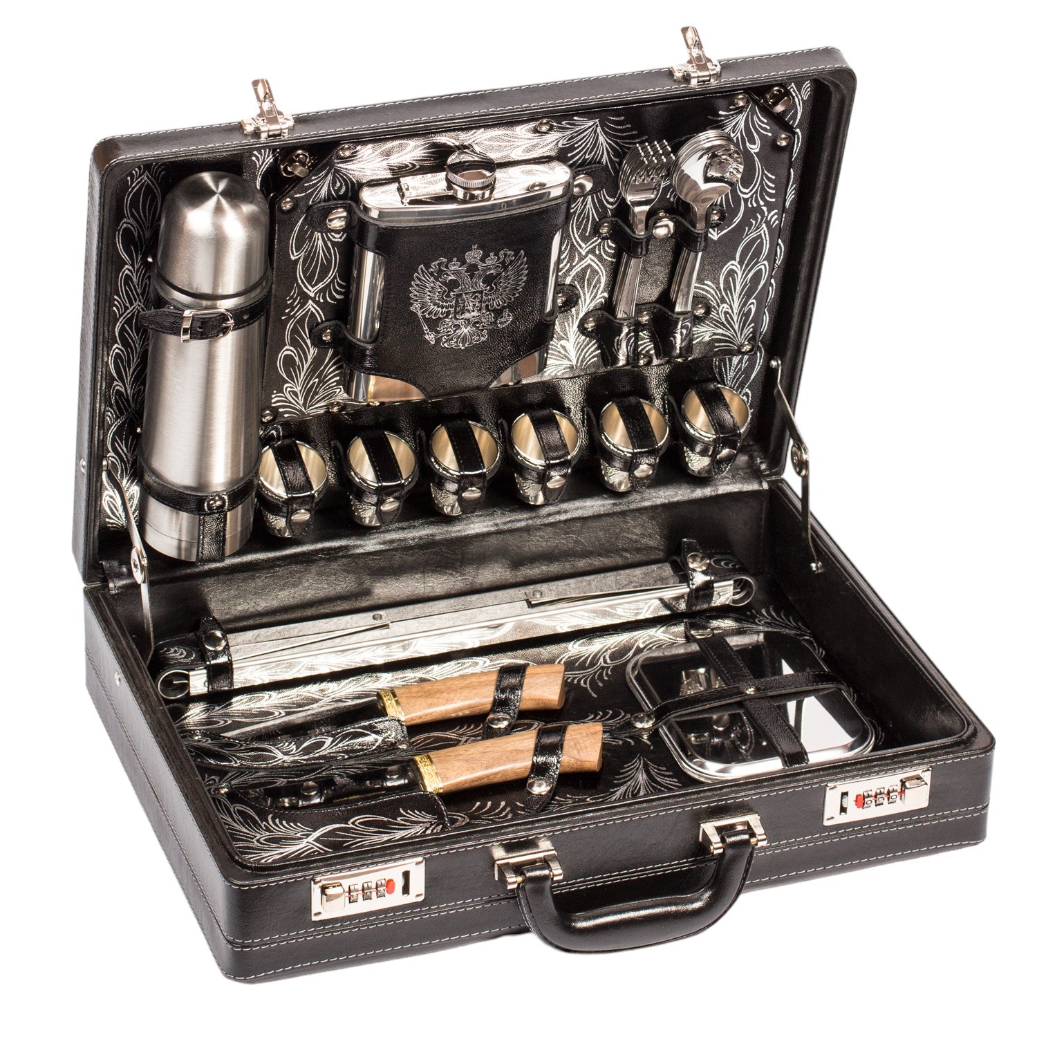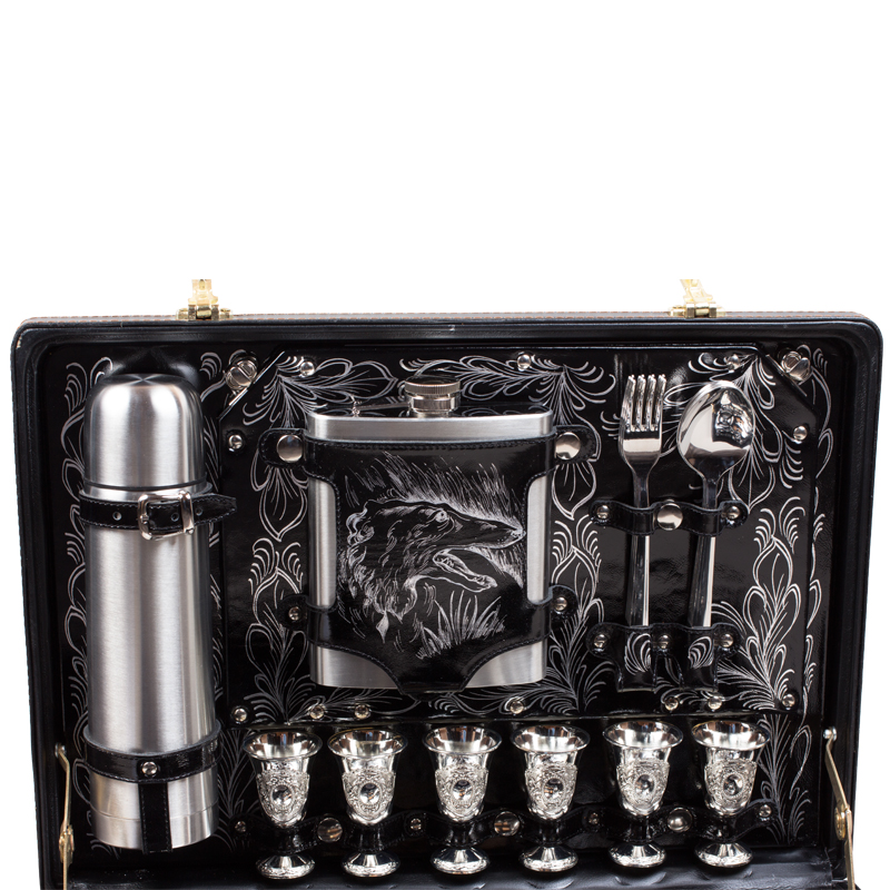 Набор "Престиж" в настоящий момент выпускается укомплектованным стопками (без ножки). Фото наборов с рюмками представлены для ознакомления с вариантами оформления кармана (чехла) фляги. Вы можете указать в комментарии к товару - какой вариант оформления вам требуется.