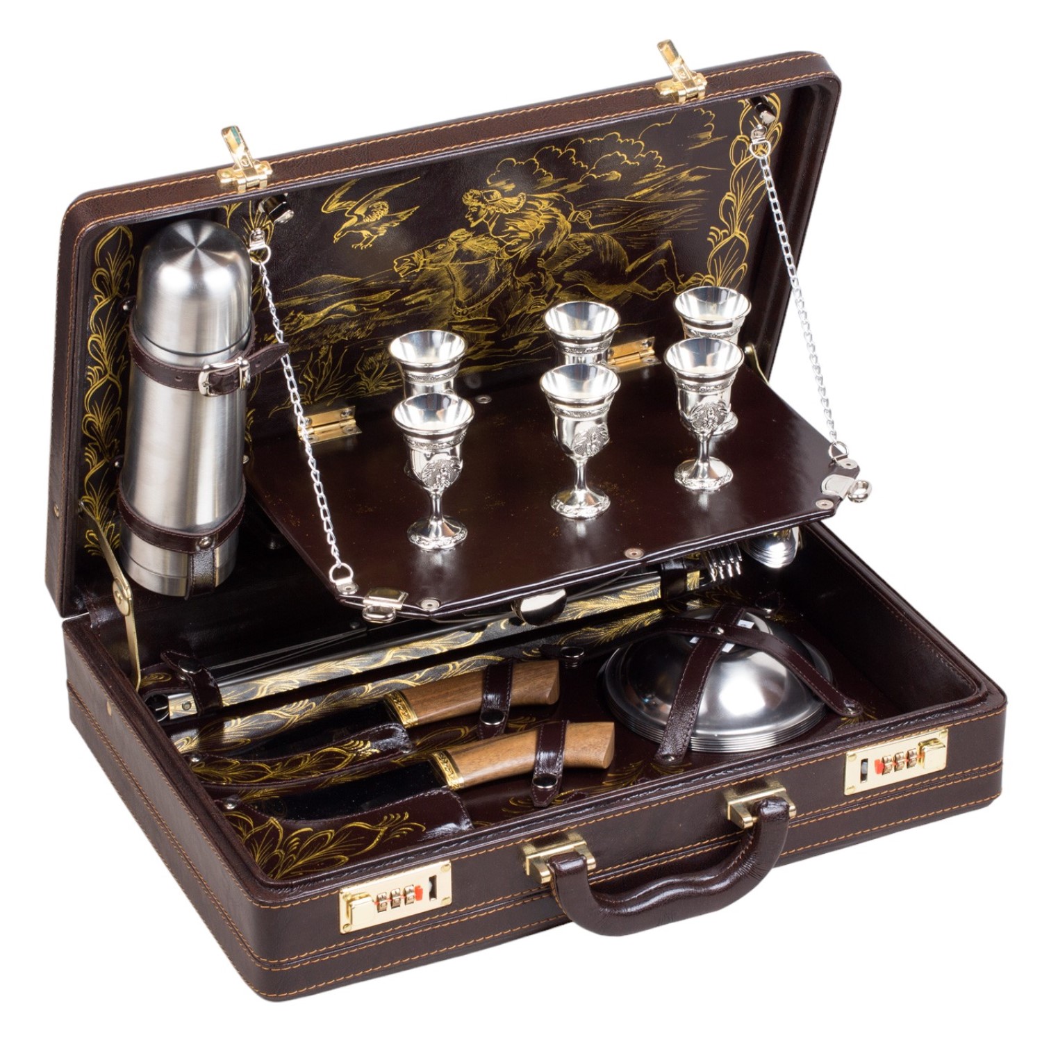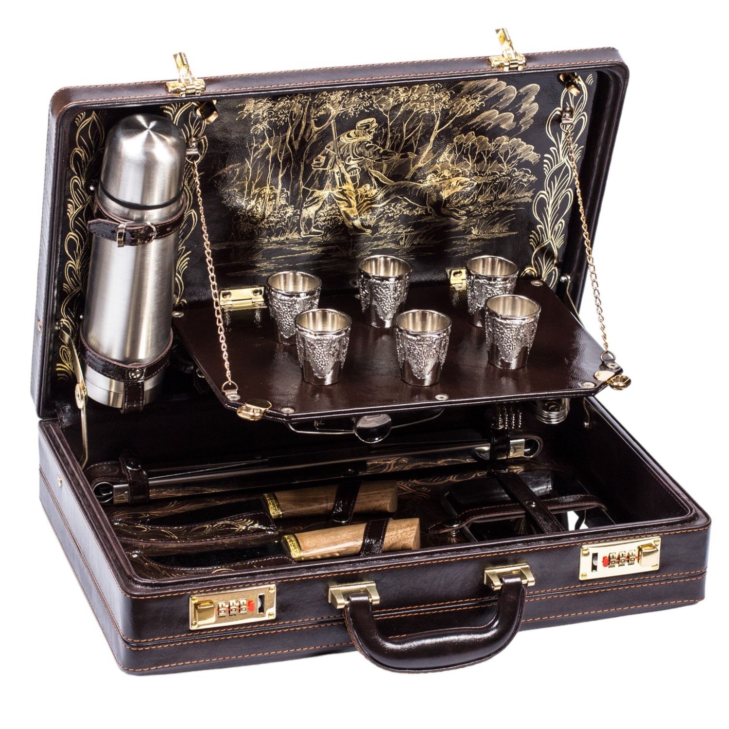 Футляр для набора заслуживает особого внимания. Строгий кожаный кейс с элегантной фурнитурой выглядит по-настоящему престижно. Для внутренней отделки наши мастера использовали монохромные рисунки на коже, нанесенные методом пирографии: это красиво и долговечно!
