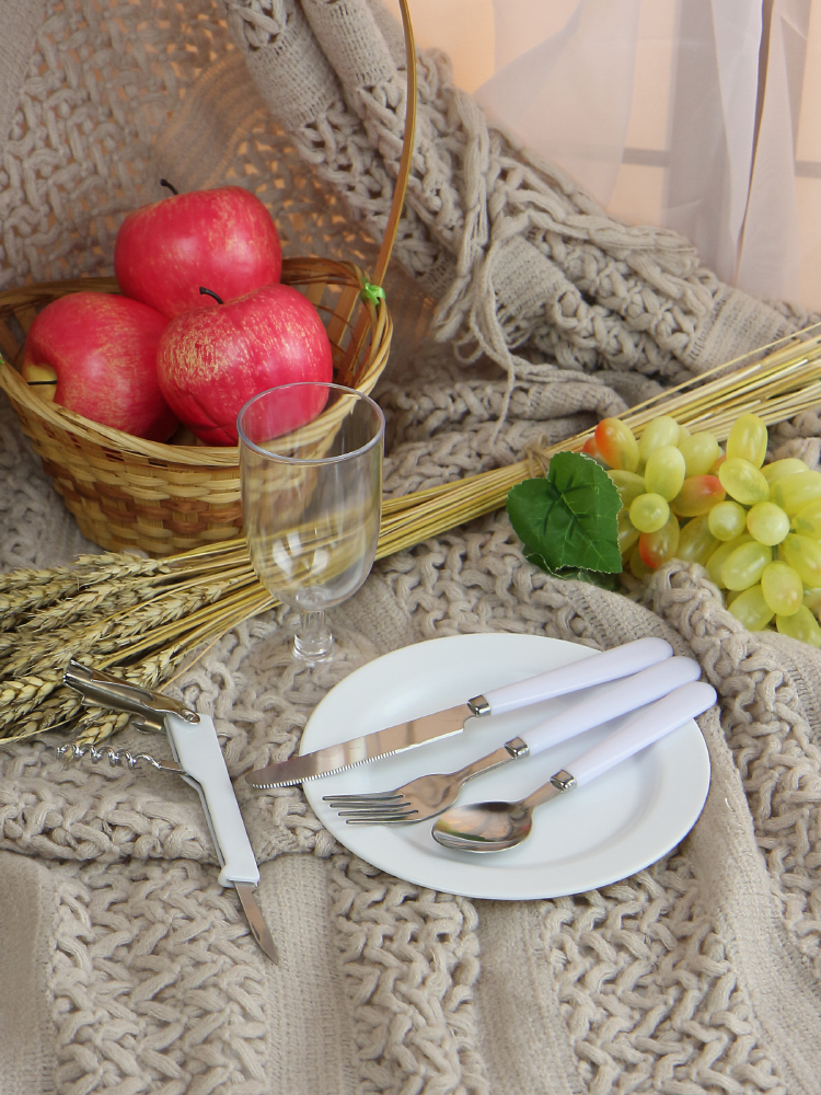 4 набора столовых приборов из нержавеющей стали с белыми пластиковыми ручками: