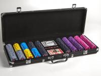 Представленный набор для покера выполнен известным китайским изготовителем игорных комплектов – компанией Partida. Он включает 500 фишек общим номиналом 166750. Все эти фишки уложены в десять рядов в специальных желобах в удобном, легком и прочном металлическом кейсе черного цвета. По центру кейса расположены места для двух колод пластиковых карт, а также для пяти костей и фишки дилера.