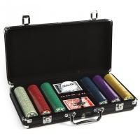 Представленный набор для покера выполнен известным китайским производителем игорных комплектов – компанией Partida. Он включает триста фишек суммарным номиналом 81 300 очков. В его составе имеются по 50 фишек с номинальными значениями 1 единица (белого цвета), 5 единиц (красного цвета), 20 единиц (зеленого цвета), 100 единиц (синего цвета), 500 единиц (фиолетового цвета) и 1000 единиц (золотого цвета). Фишки размещаются в специальных желобах в шесть рядов, по три с каждой стороны от центра удобного металлического кейса черного цвета. В центре кейса предусмотрено место для двух колод пластиковых карт, а также для фишки дилера и пяти костей.