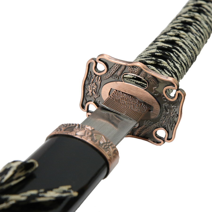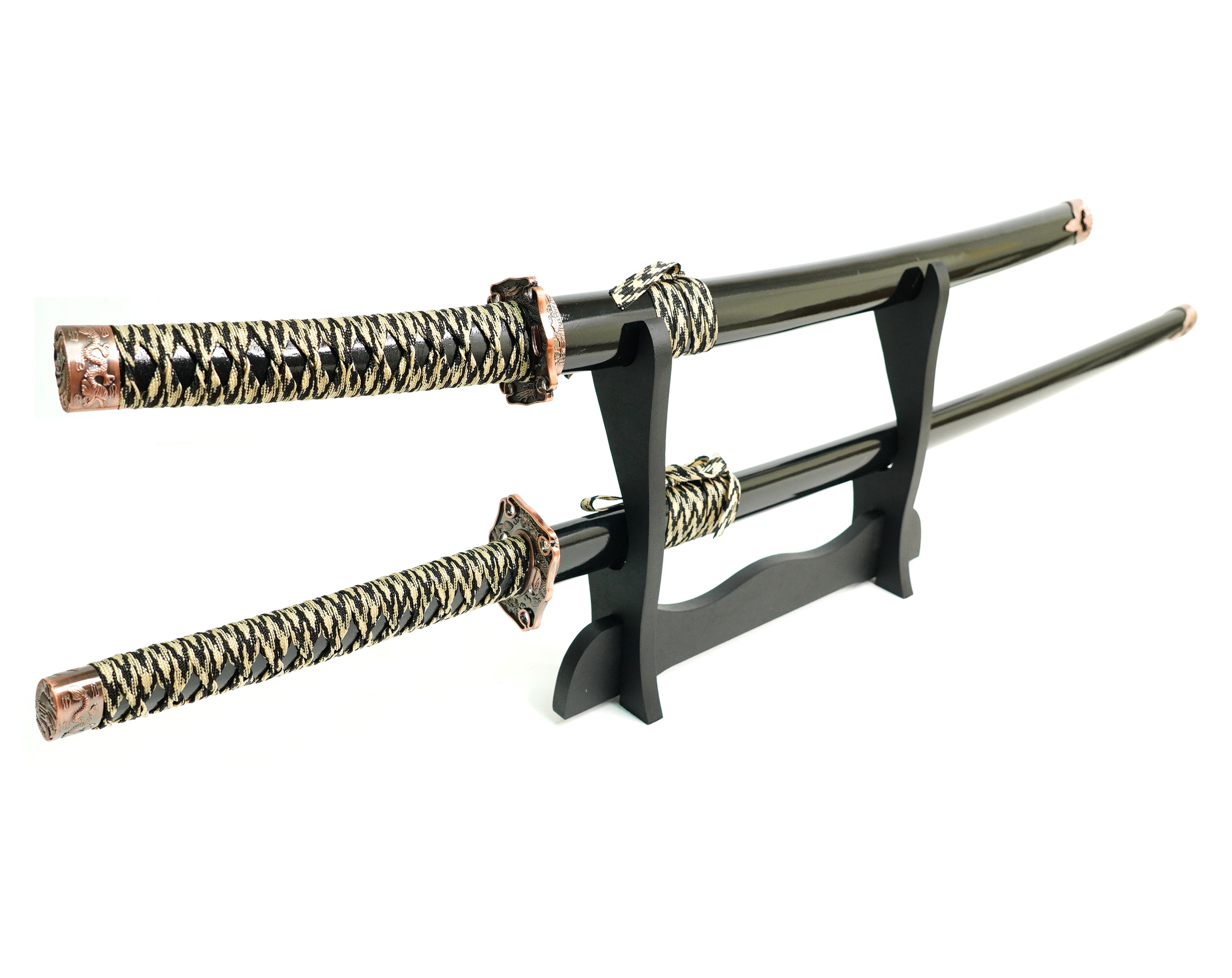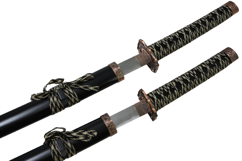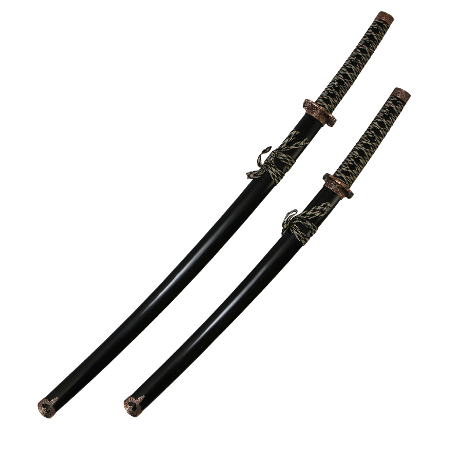 Набор из двух японских мечей с черными классическими ножнами и цубой окрашенной под медь с изображением дракона