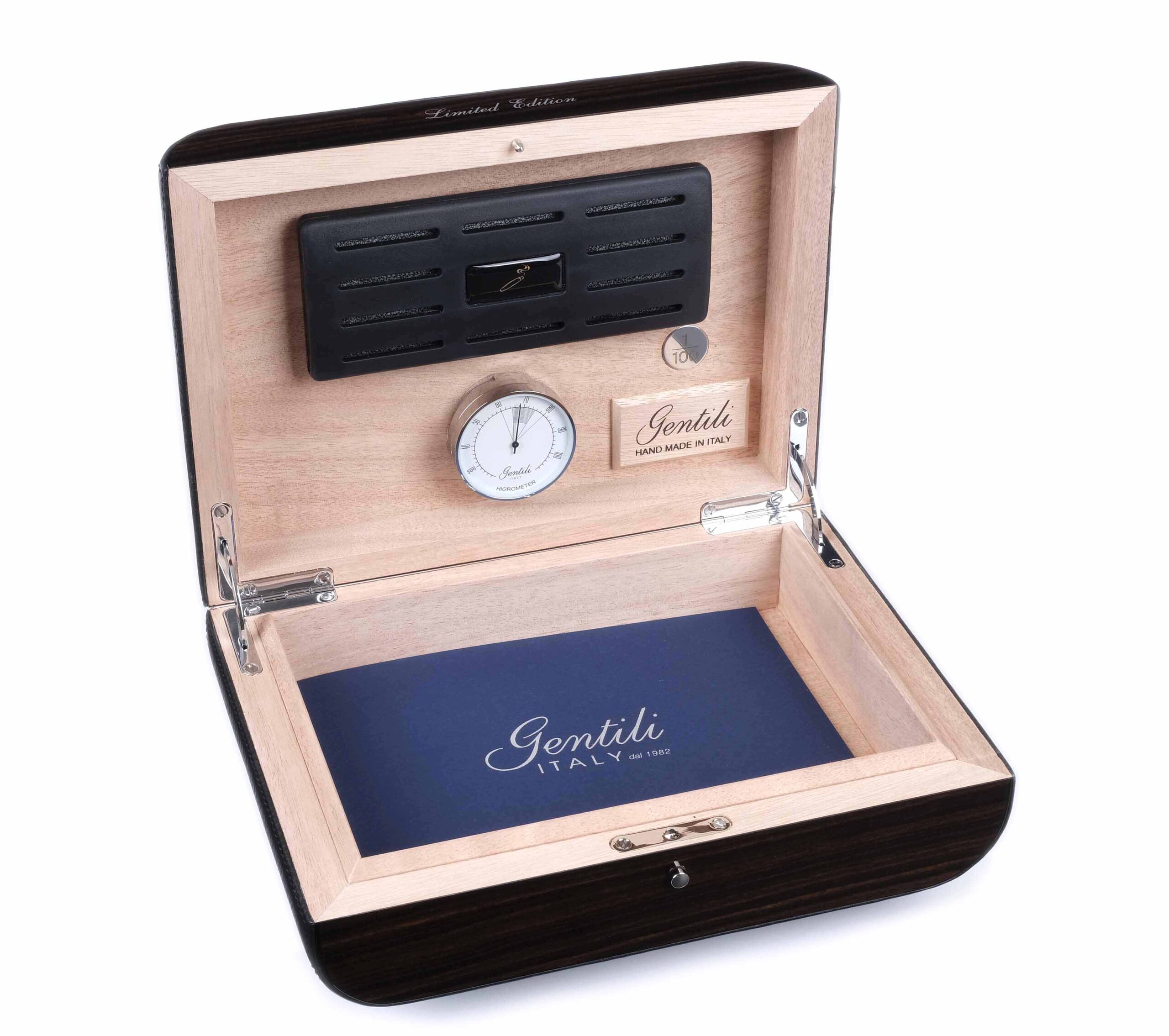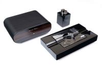 Настольный набор элитных сигарных аксессуаров от итальянской компании Fabrizio Gentili, состоящий из трех предметов: хьюмидора для хранения 10-ти сигар лимитированной серии из 100 штук, элегантной пепельницы и турбозажигалки.