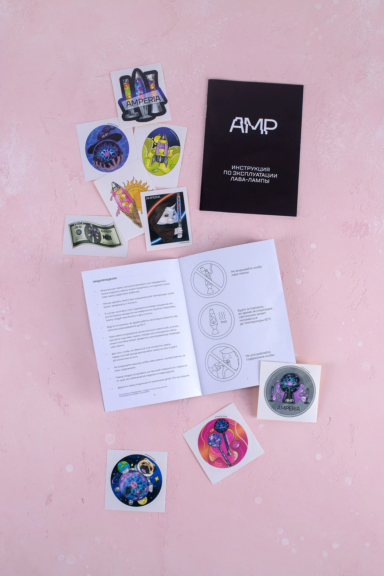 Лава лампы Российского бренда Amperia отличаются качеством изготовления. Для подсветки используются более энергоёмкие галогенные лампочки. С каждой лампой в комплекте идёт дополнительная запасная лампочка и подробная инструкция на русском языке.