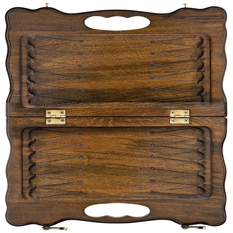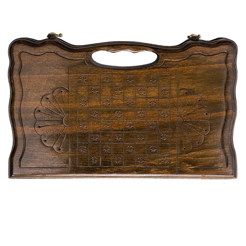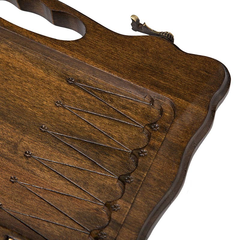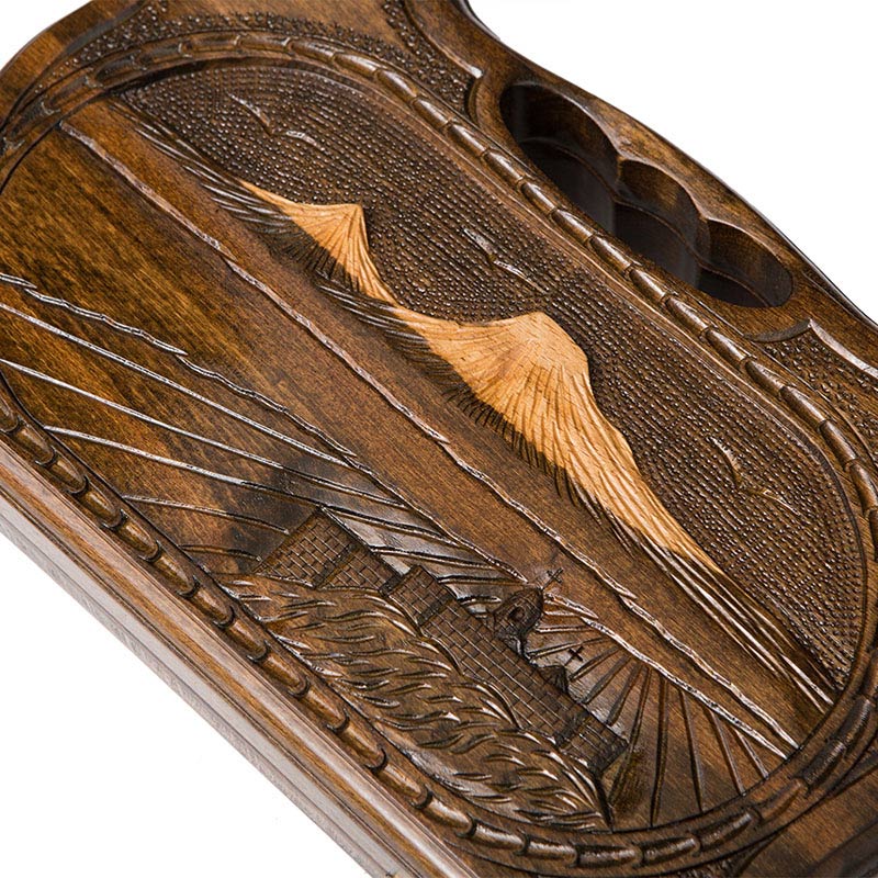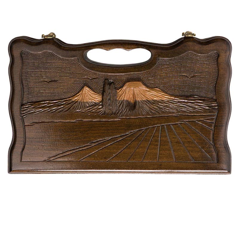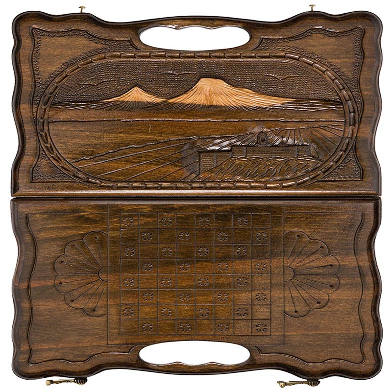 Эта доска относится к средним размерам - длинная сторона 40 см, а есть еще малая и большая, поэтому вы сможете выбрать подходящую. Использование древесины букового дерева положительно сказывается на сроке эксплуатации и прочности. Сверху она покрыта несколькими слоями лака, для предотвращения деформации от случайного попадания воды и т.п. В качестве рисунка на внешнюю сторону нанесена гора Арарат, причем так естественно, как ни один 3D принтер не сможет. На противоположной стороне имеется поле для шашек.
