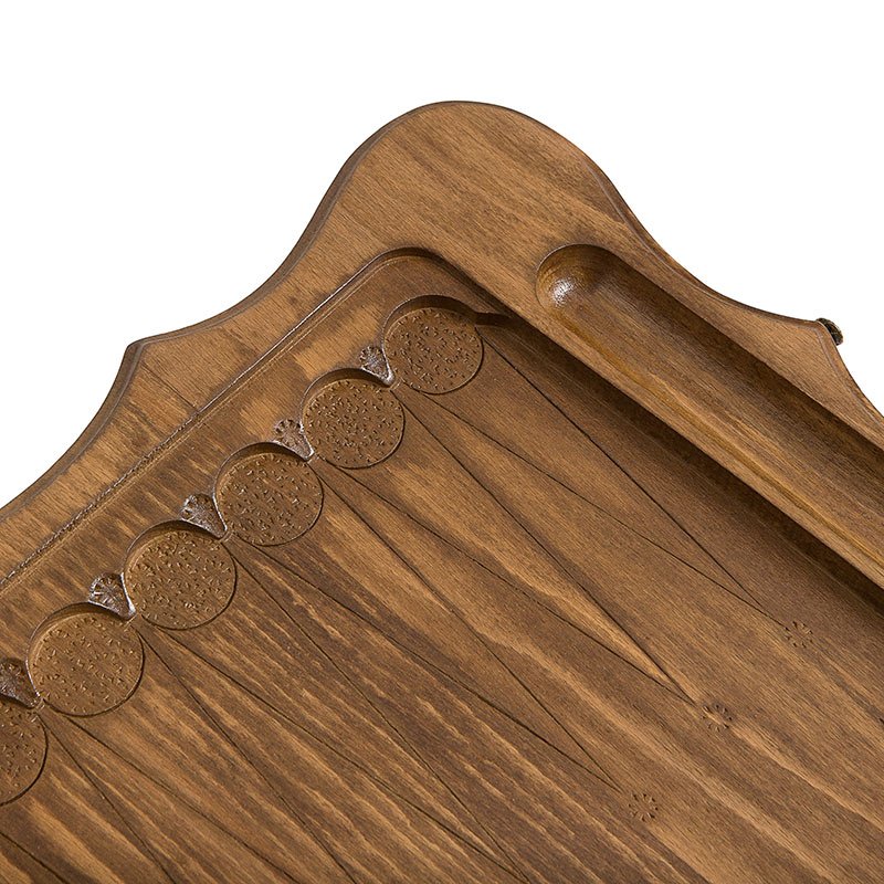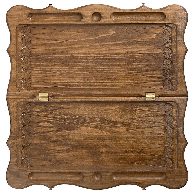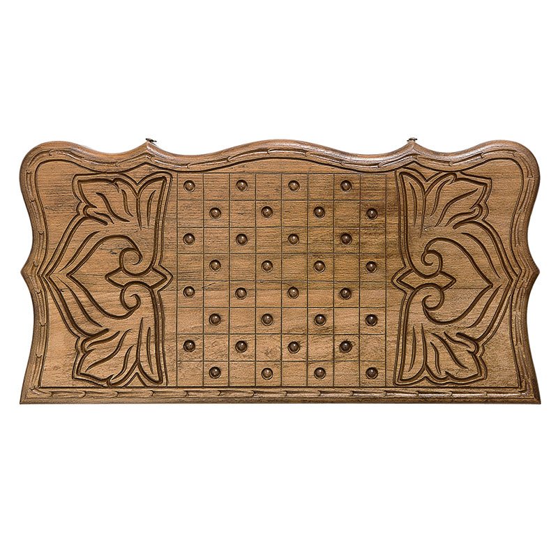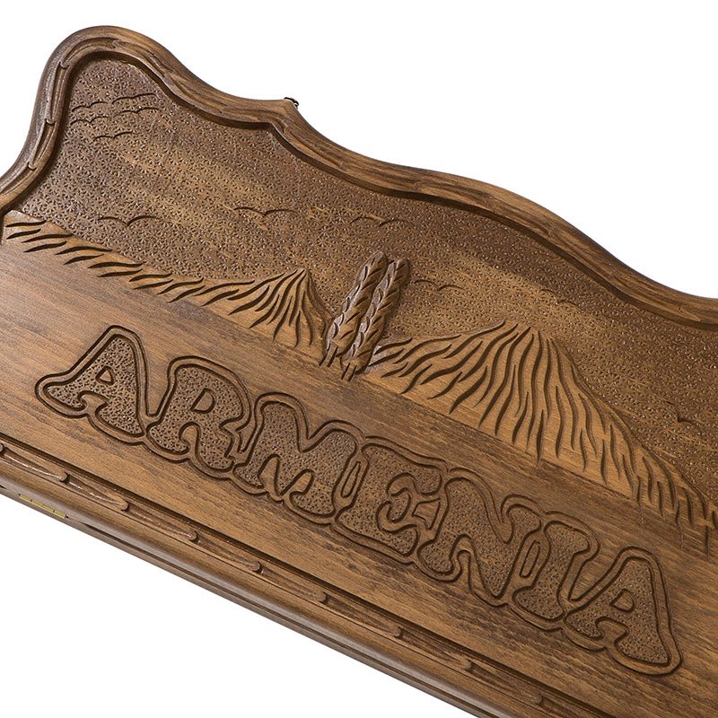 Сама древесина бука обладает очень интересной текстурой, которая тут специально подчеркивается лакированным покрытием. С внешней стороны вырезано вручную изображение гор Армении. Мастер выполнил резьбу очень качественно и в своей, уникальной манере. Резьба специально сделана в выпуклом виде, что придает им некоторую уникальность. На другой створке вырезано поле для игры в шашки, для чего можно будет использовать фишки из комплекта поставки. Внутренние поверхности украшены мелким рифлением на каждой отдельной ячейке.