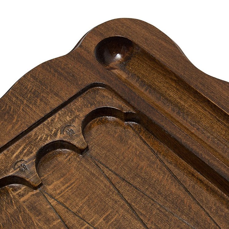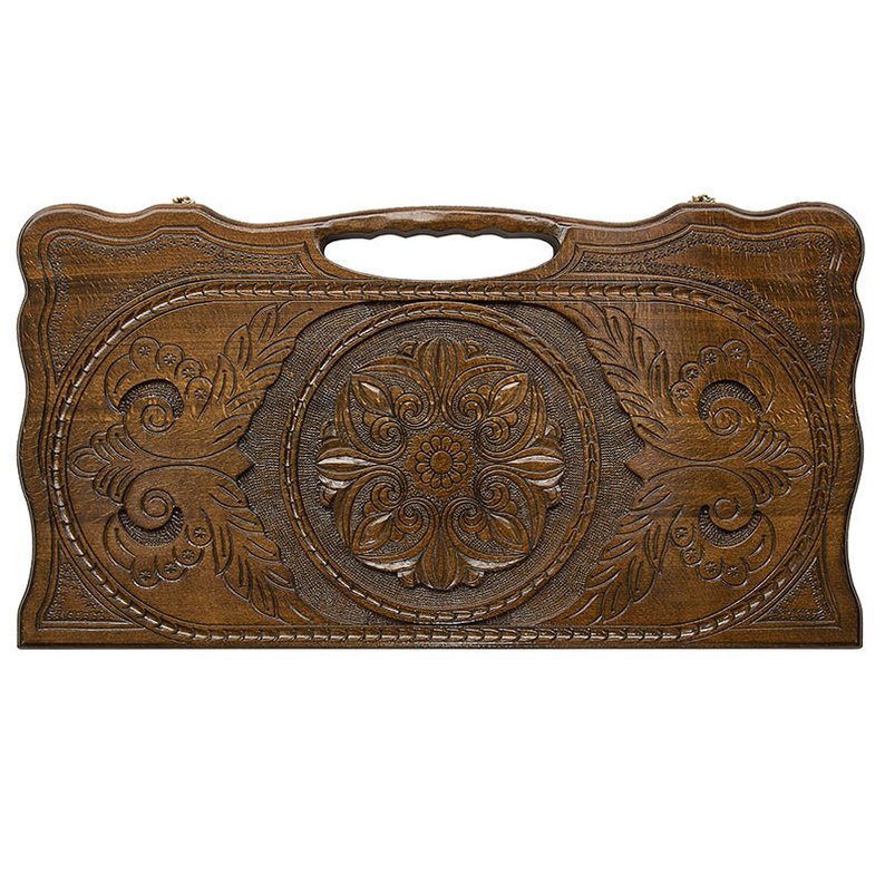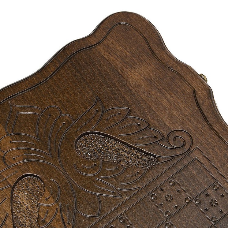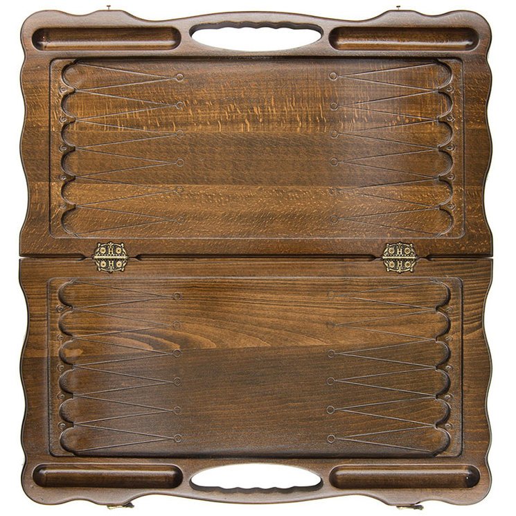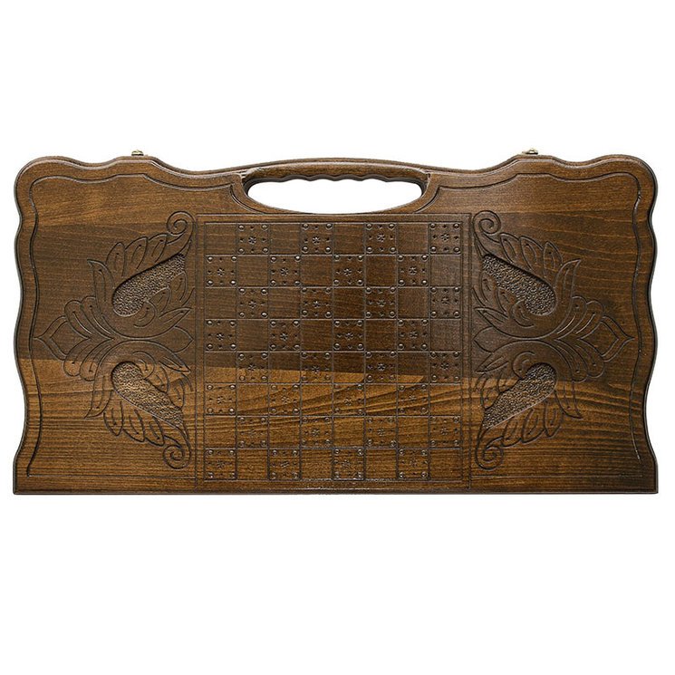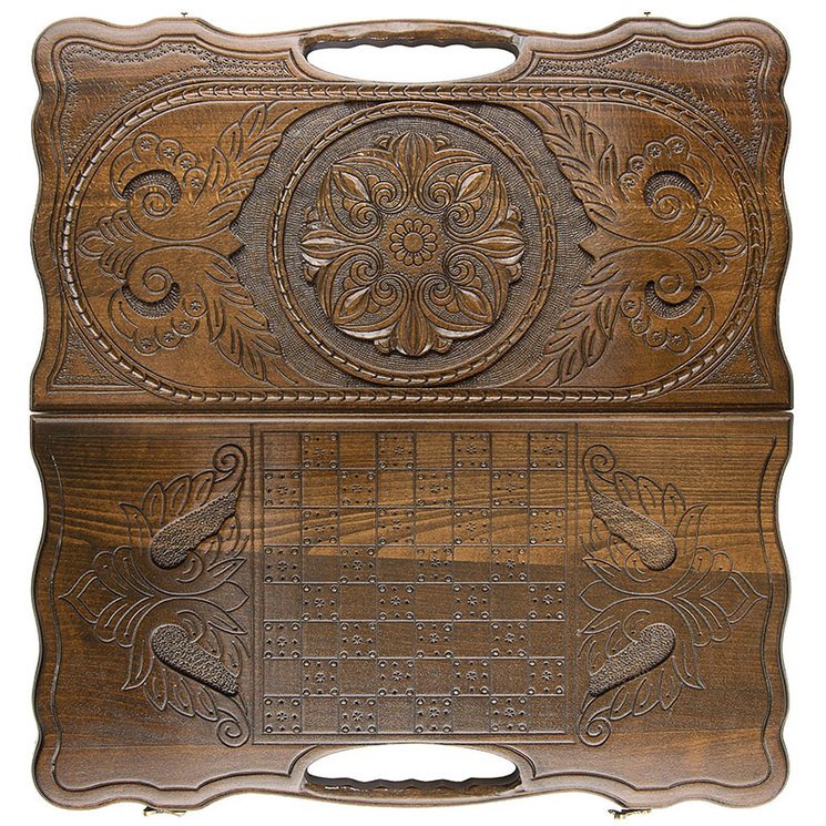 В качестве украшения служит изысканный узор, нанесенный на переднюю поверхность. Несмотря на то, что тут используется исключительно ручная работа, все детали вырезаны аккуратно. С обратной стороны предусматривается поле для игры в шашки, за которыми можно будет расслабиться после напряженных баталий в нарды. Изнутри использован минималистичный стиль - только лишь треугольники, подчеркивающие каждую ячейку. На петлях имеется гравировка эмблемы производителя в виде буквы H.