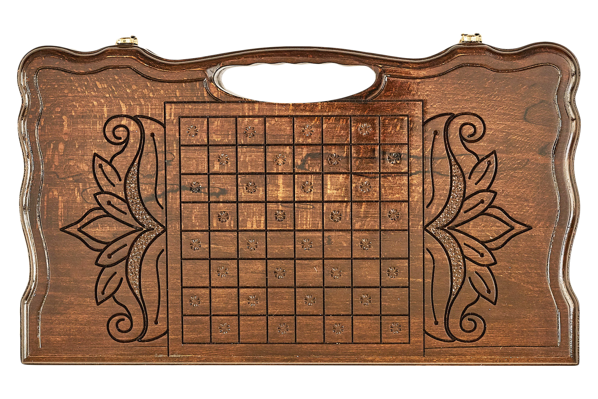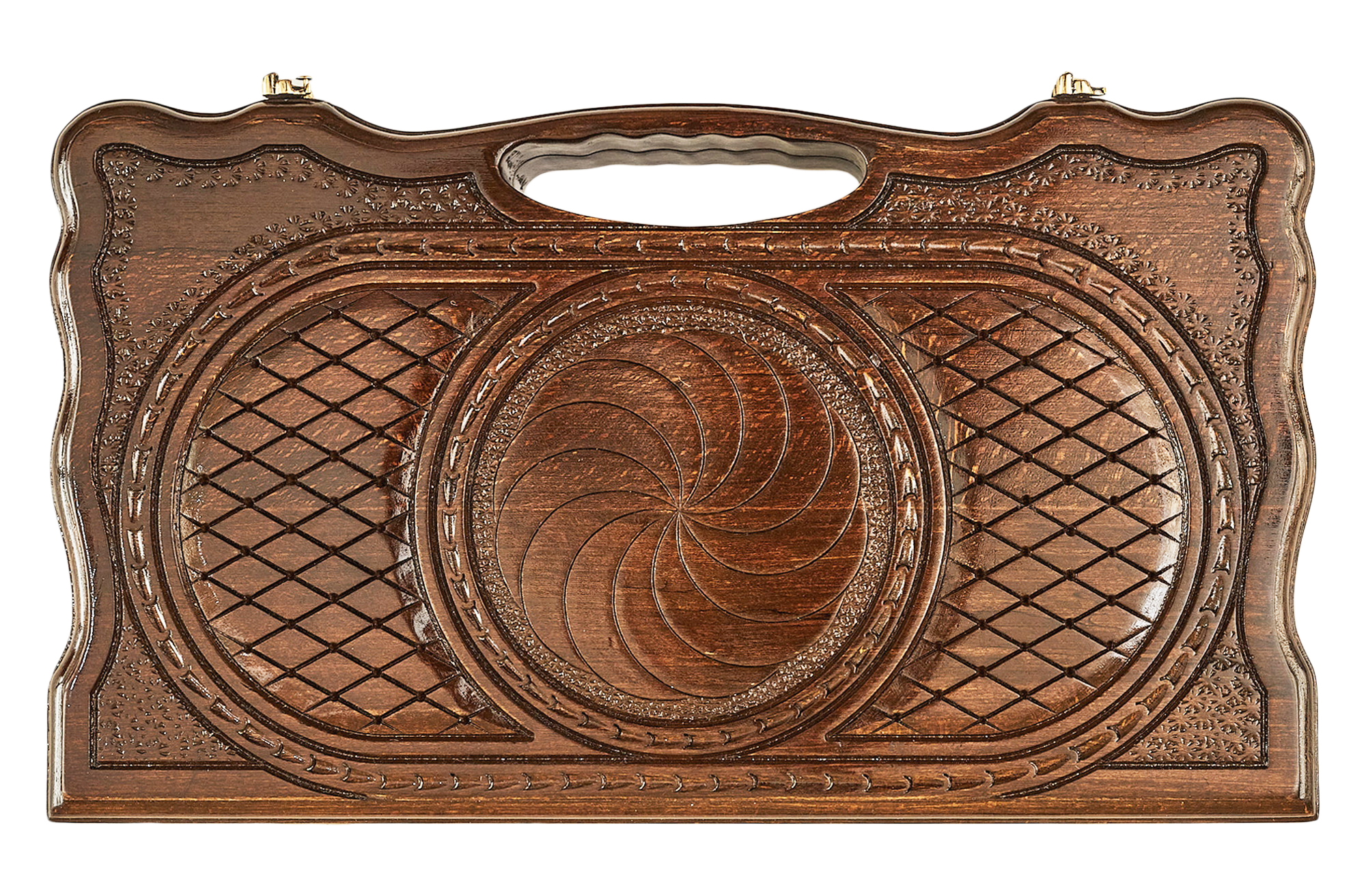 Дерево покрывается лаком, что не улучшает технические характеристики, но и придает блеска. Нарды резные Бесконечность украшены изысканным узором, нанесенным с обеих сторон доски. В середине находится круг, разделенный на сектора, и когда смотришь на них, впадаешь в некое подобие гипноза, будто наблюдаешь за течение воды или горением огня. Все выполнено очень детализировано и даже если придираться, вы не найдете каких-либо изъянов.