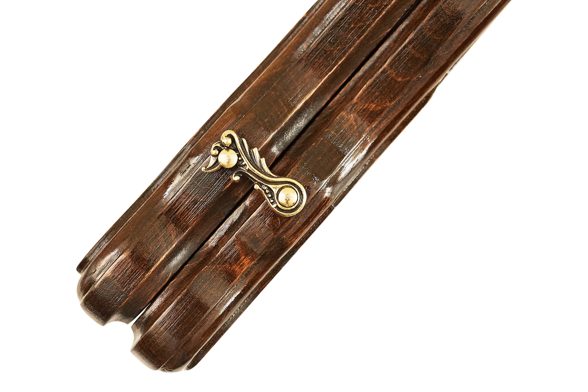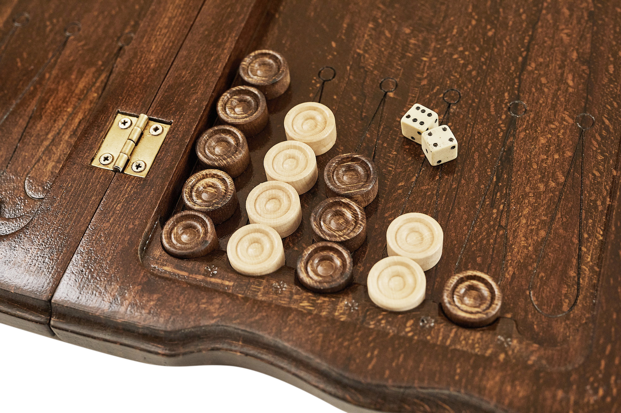 Для доски использована древесина орешины, что гарантирует долгий срок службы, даже при ежедневной игре. К тому же, она отличается изысканной фактурой, что придает готовому изделию уникальности и престижности. Для сцепления створок используются бронзовые петли, а закрываются они на специальные крючки из ичного материала. Фишки также прочные, а чтобы случайно не сломать их или доску при игре, снизу предусмотрена прокладка из ткани.