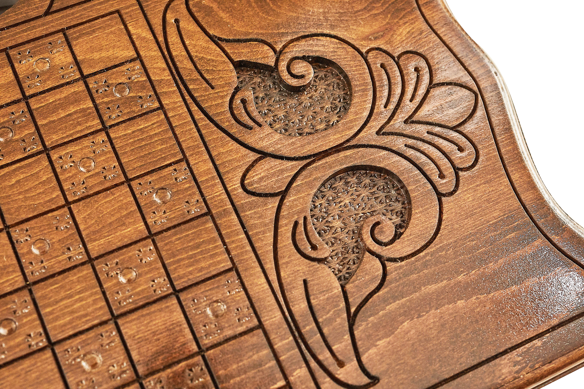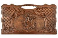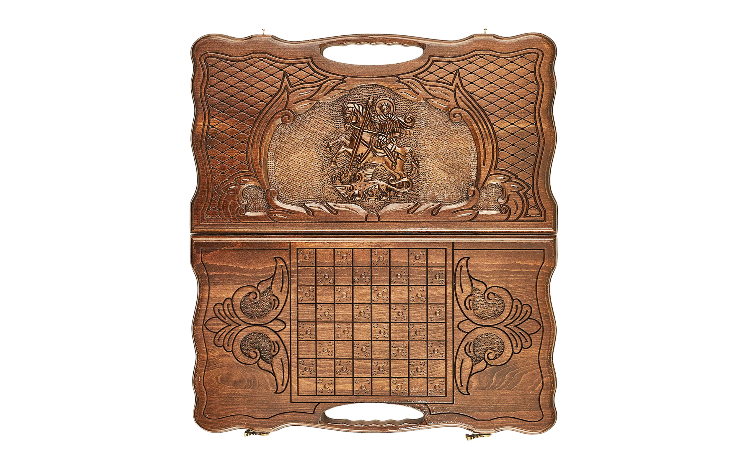 Резные нарды «Георгий Победоносец» - классическая настольная игра, украшенная изображением одного из самых почитаемых в Христианстве святых. Композиция выполнена талантливым армянским мастером на натуральной буковой древесине, этот набор покоряет детализацией и проработанностью мельчайших нюансов. Для увеличения долговечности доска покрыта защитным лаком. Кроме того, скрепляется она надежными и износостойкими бронзовыми петлями. Также от повреждений доску защищают специальные накладки на каждой фишке в комплекте.
