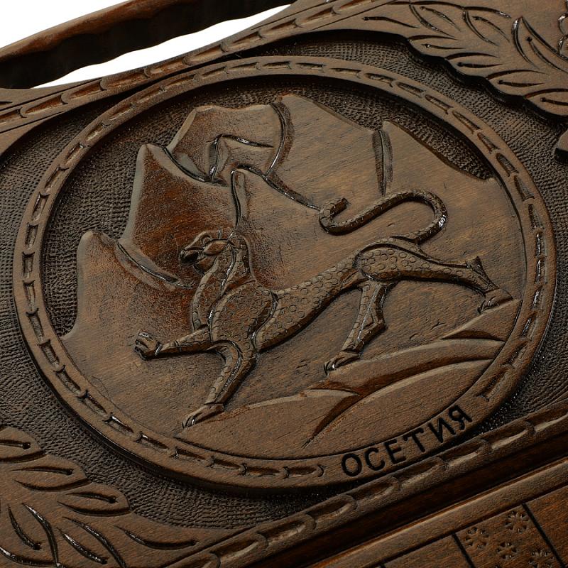 На лицевой стороне можно увидеть вырезанный вручную Герб Осетии, который и дал название нардам.