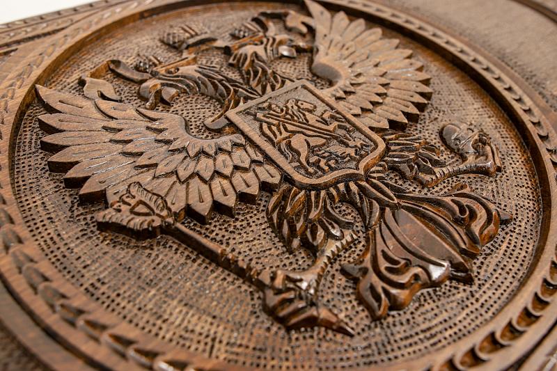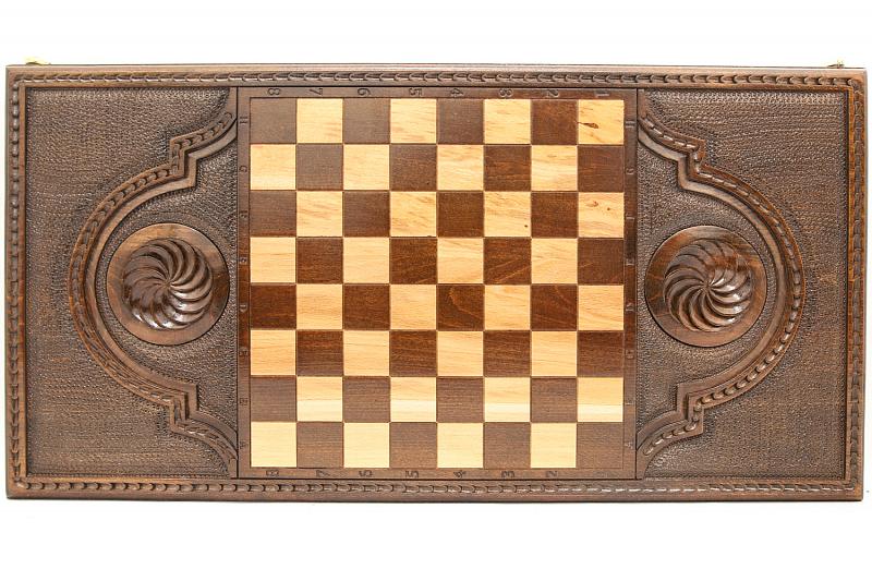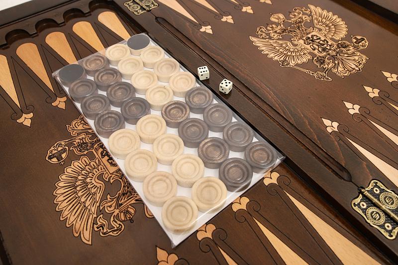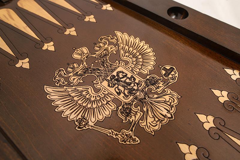 Верхняя крышка украшена резным рисунком национального символа РФ, а на задней нанесено поле для шашек. Внутри – нардовое поле. Каждая фишка в наборе имеет бархатную подложку, что предотвращает царапание поверхности доски.