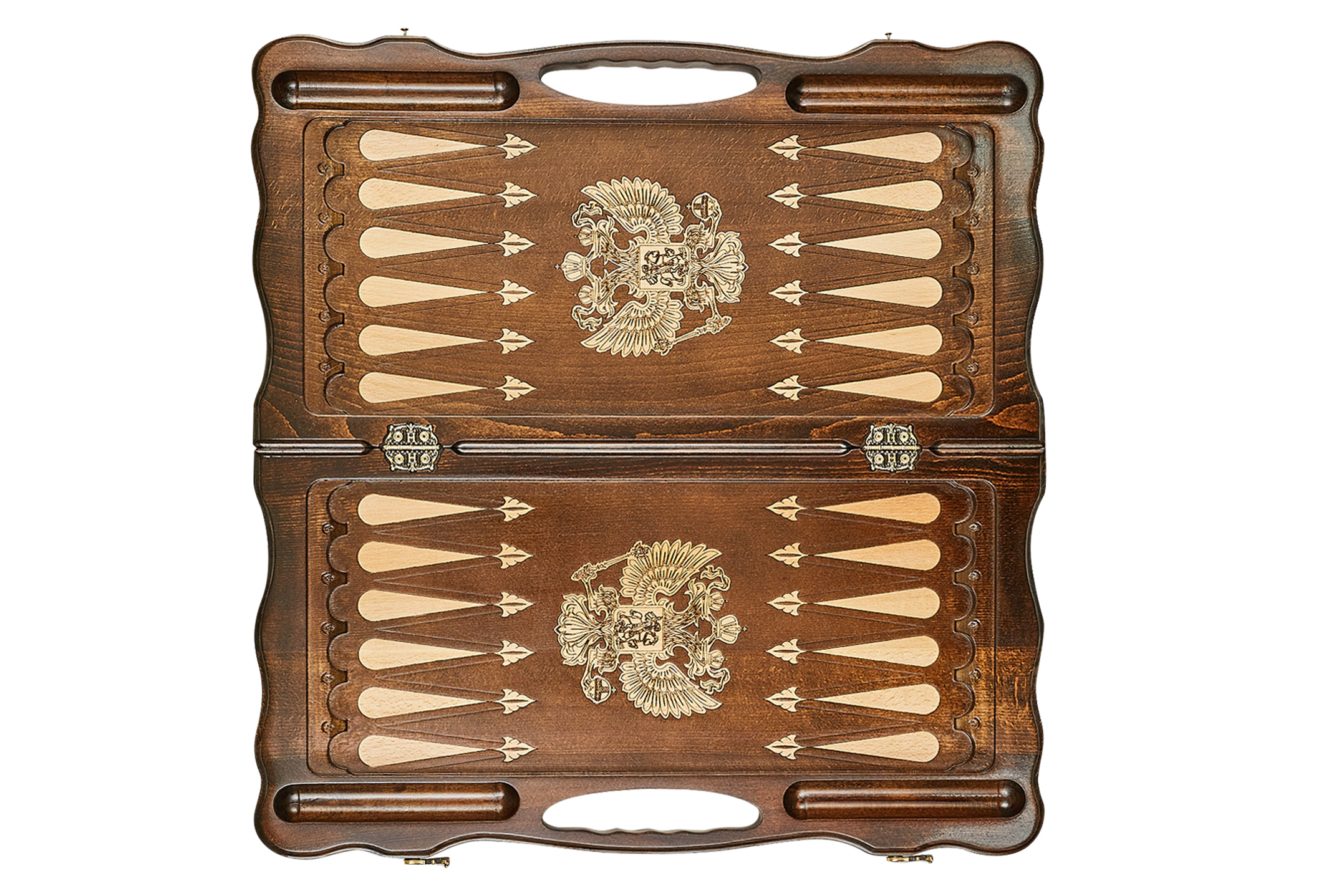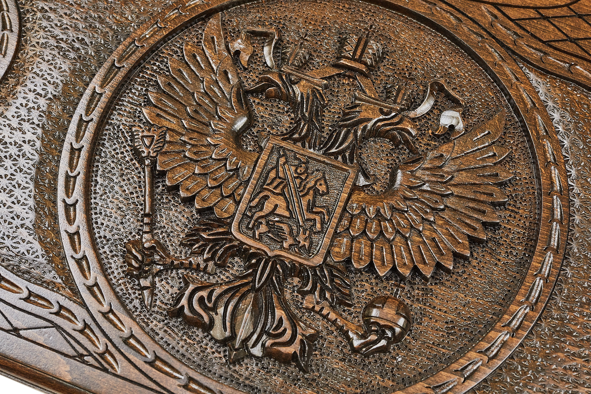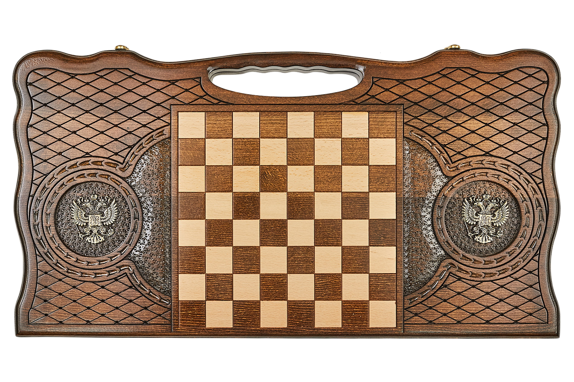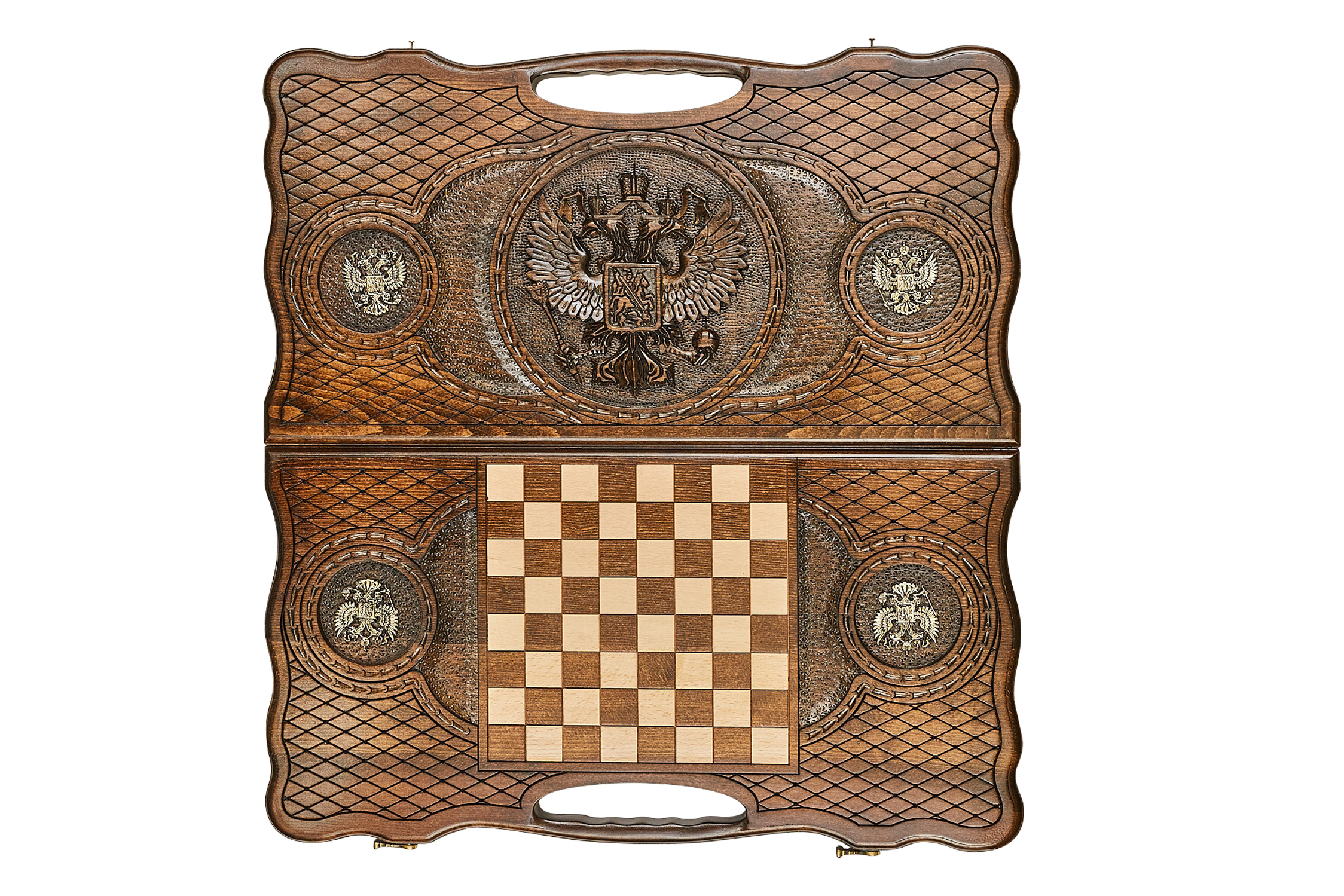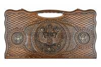 «Герб РФ 3» - подарочный набор классических настольных игр, состоящий из нард и шашек, и изготовленный из натуральной древесины высокого качества. Доска выполнена в технике резьбы и поражает своей красотой, детализированностью проработки каждого элемента.