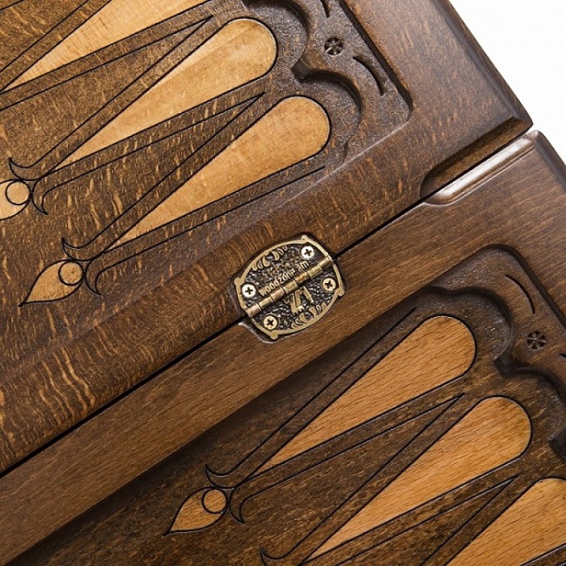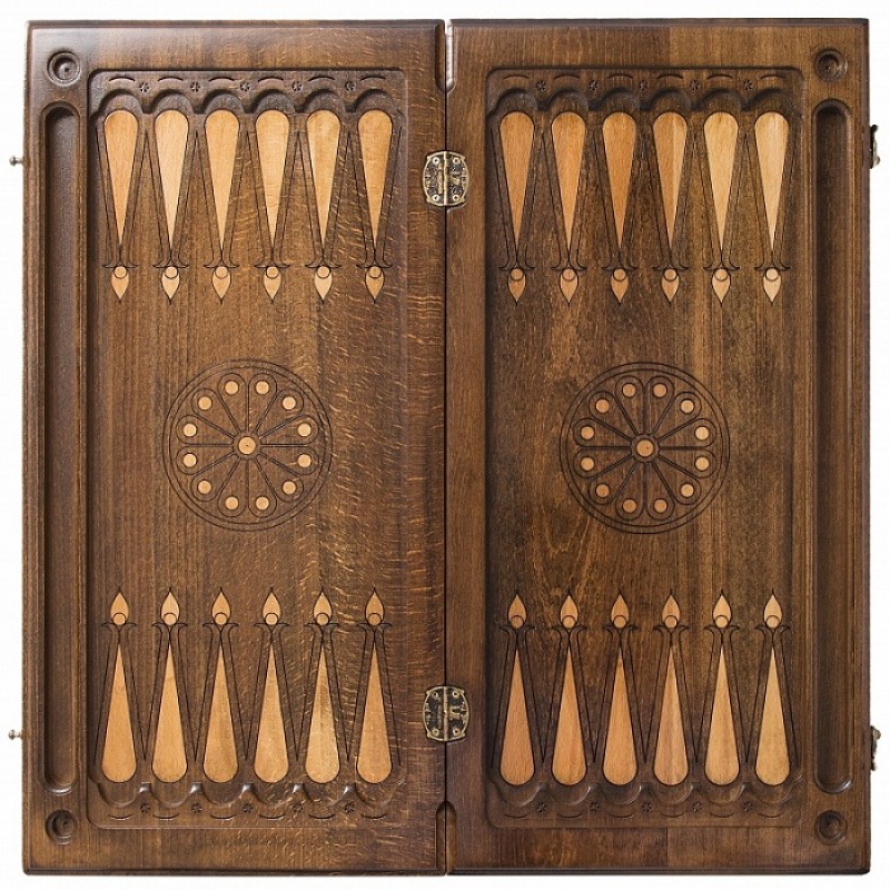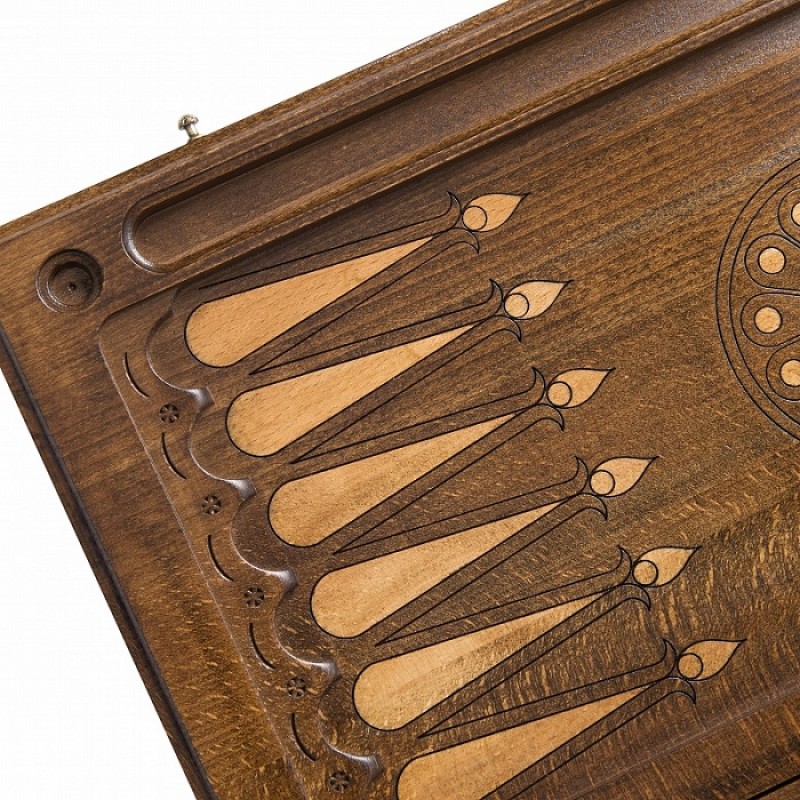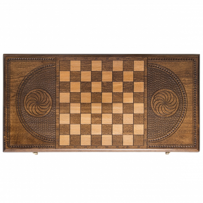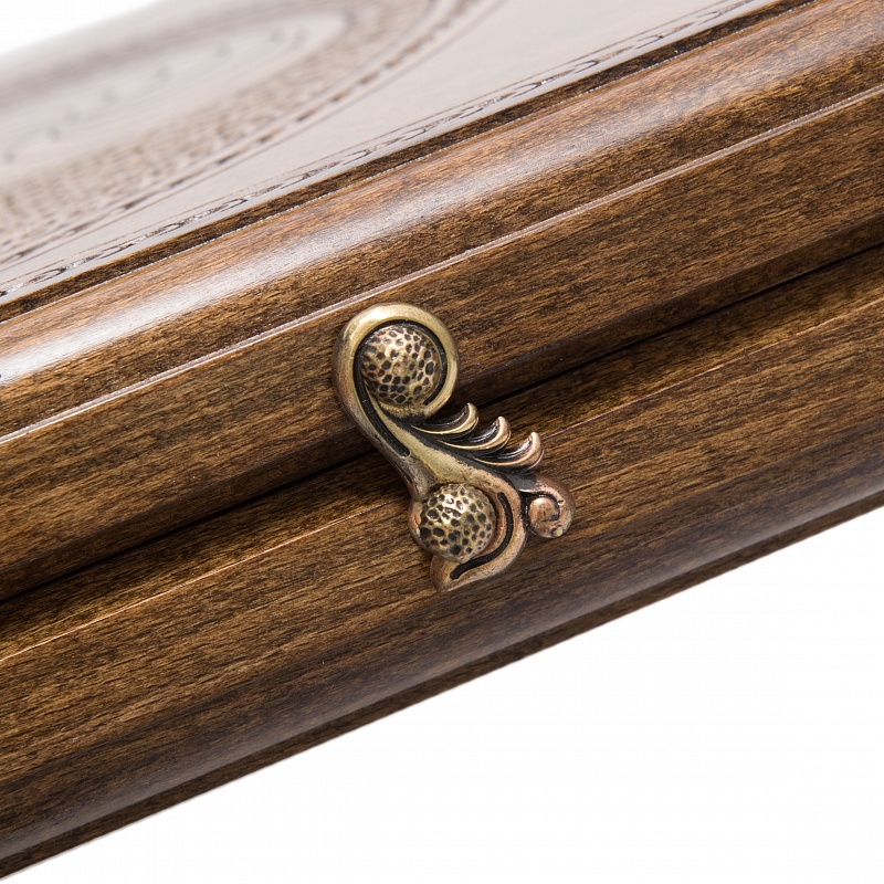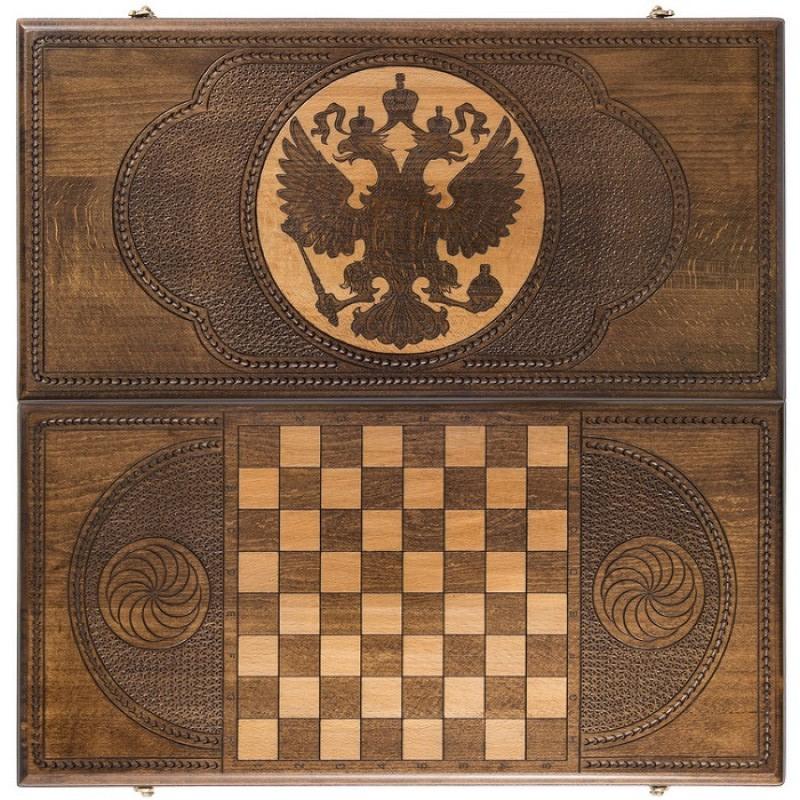 Доска из натуральной древесины украшена фактурными резными узорами, которые не только красивы, но и тактильно приятны, а также гербом РФ. На обратной внешней стороне нанесено поле для шашек. Части доски скреплены фурнитурой из настоящей меди. Фишки стандартные, оснащенные противоцарапными подложками.