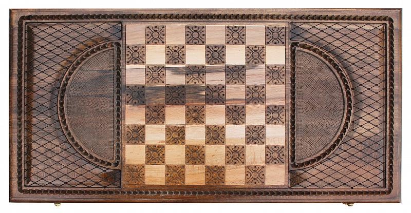 Комплект включает в себя необходимые для игры фишки и кости, а также удобный мягкий чехол с деревянной ручкой, который поможет бережно хранить или перевозить изделие.