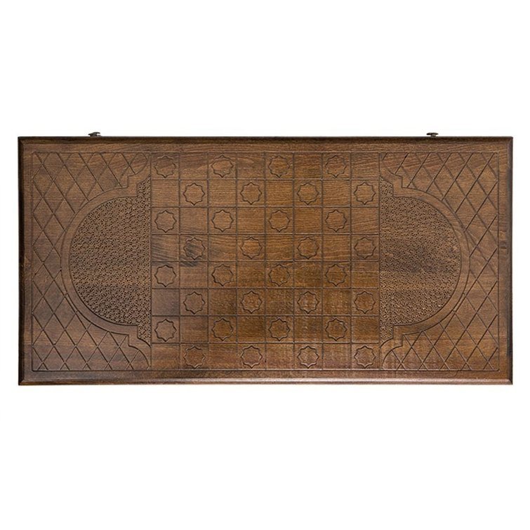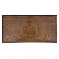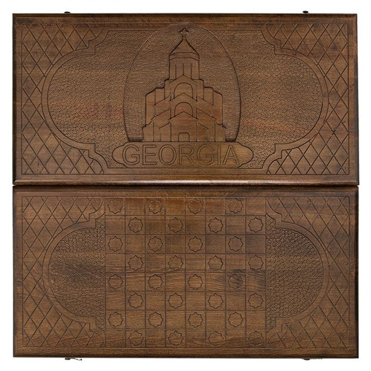 Нарды резные Грузия выполнены полностью вручную и могут похвастаться красивым оформлением. С наружной стороны, в узорном окаймлении, вырезан грузинский храм, причем сделано это максимально качественно и детализировано. На другой половине разлиновано поле для игры в шашки, что позволит расслабиться в перерыв между напряженным баталиями в нарды.