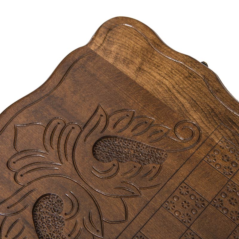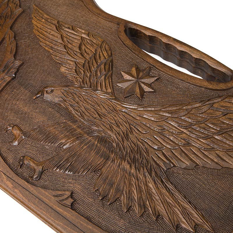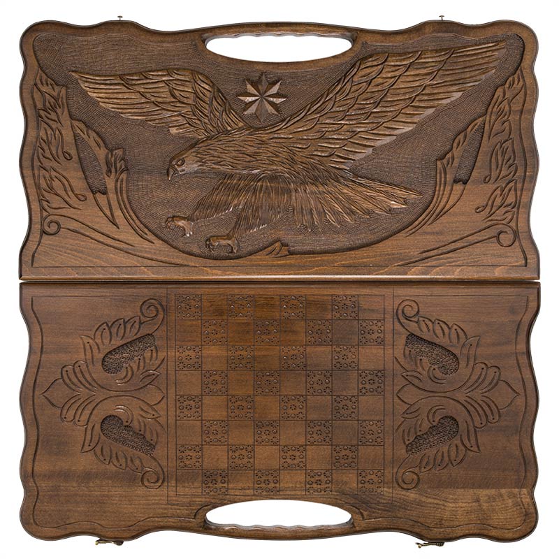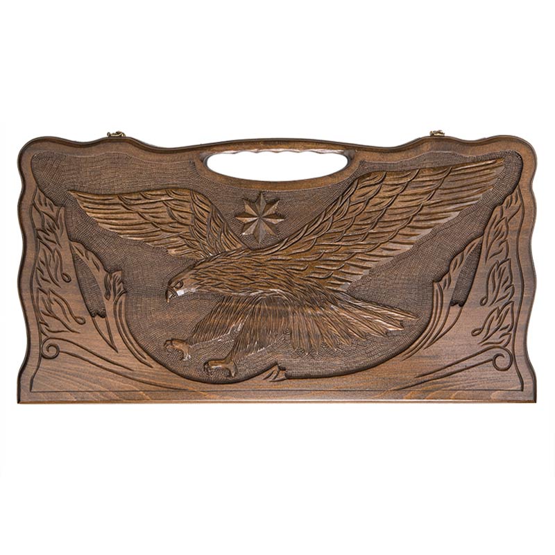Тяжело придумать лучший подарок для любителя настольных игр и ценителя красоты, нежели выполненная полностью вручную доска для нард. Она изготовлена мастером своего дела из Армении, широко известном в данных кругах - Кареном Халеяном. На протяжении более десятка лет, он занимается ручной резкой и оформлением досок, каждая из которых становится шедевром. Достаточно только одного взгляда на внешнюю сторону, чтобы убедиться в его профессионализме. Рисунок летящего орла выполнен максимально детализировано и реалистично - кажется, что вот сейчас он своими цепкими когтями схватит добычу и улетит к себе на Родину, в Армению.